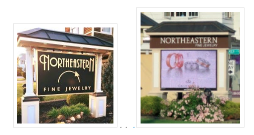 p.s. A Sour Note: It was disheartening to see that, ten weeks after Northeastern Fine Jewelry was informed by the Schenectady Planning Department that the program on its large, bright, close-to-the-street digital screen was not in compliance with the City Code and its special use permit, the sign is still not in compliance. It is still changing more often than allowed by the Zoning Code and its Permit [no more than every 8 seconds], and using movement and gimmicks that make the sign even more distracting along your busy, mixed-use streetscape. Click here for a 44-second video clip that contains at least 10 changes. For more on this story, see the posting “Is anyone enforcing our digital sign rules?“. [The image above shows the former, tasteful and effective sign and the current digital sign.]