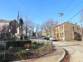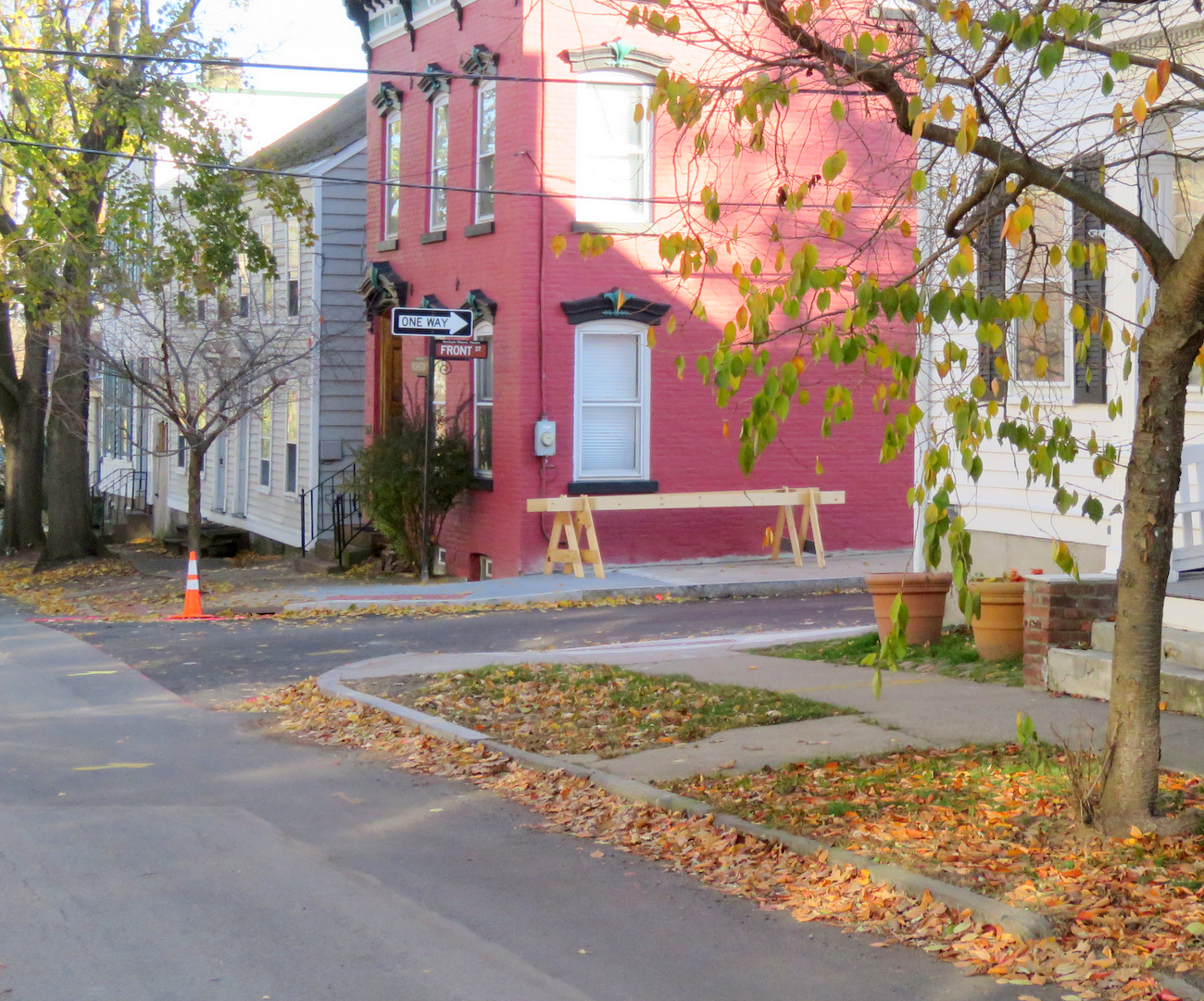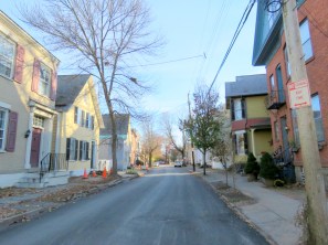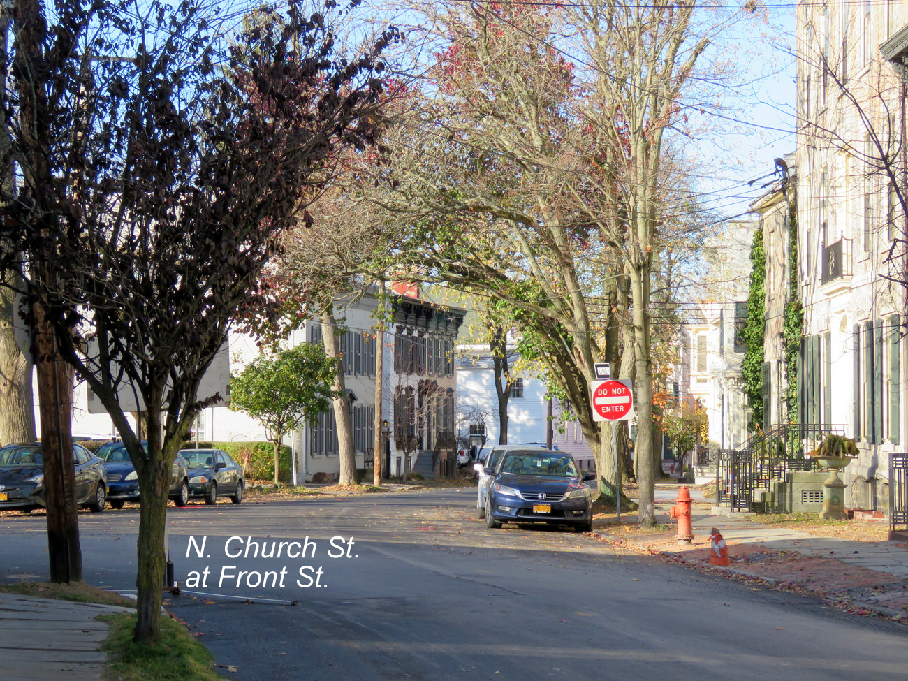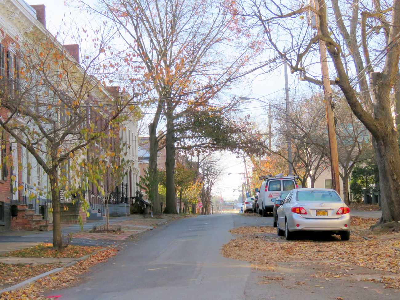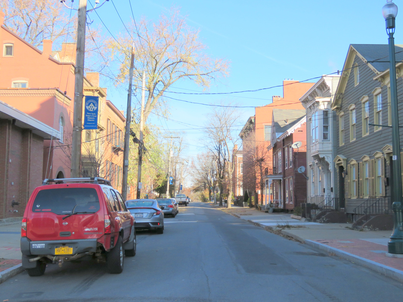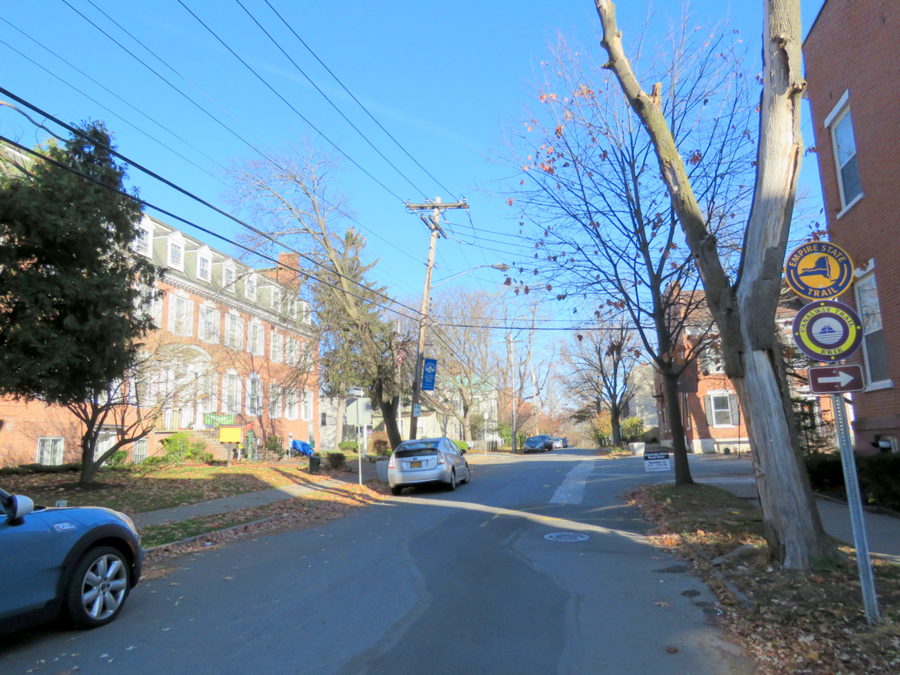 Just past 8:30 A.M. today, twenty-four hours before the 2019 Stockade-athon will rush through the Stockade District, I took my camera out to see the conditions along the route (sun, cold, tripping problems in the roadway, etc.). My fingers definitely needed thin gloves to operate the camera. The lead escort car should turn onto Washington Avenue from State Street at about 8:32 AM, heading north on Washington Avenue and, after two blocks, turning right onto Front Street, with runners heading east past Lawrence Circle and continuing all the way to the rotary at Erie Boulevard and up Nott Street. (Scroll down for a map of the Stockade leg of the Race)