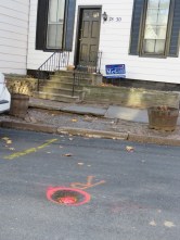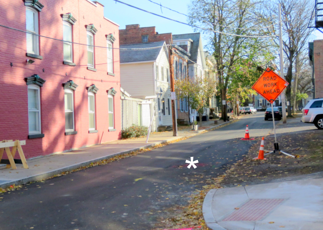 . . asterisk in the photo immediately above marks a hazard at the turn onto Front street . . shown in the photo to the right, 2 holes stretching 18 inches. The red-circled hole just below is in front of 28 Front Street, just a couple doors before crossing Lawrence Circle: