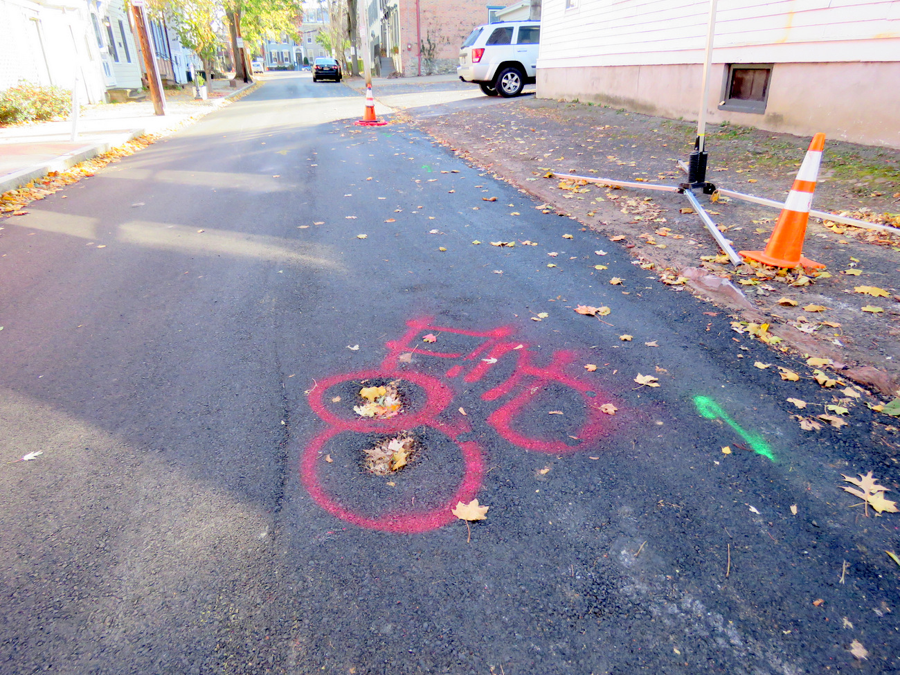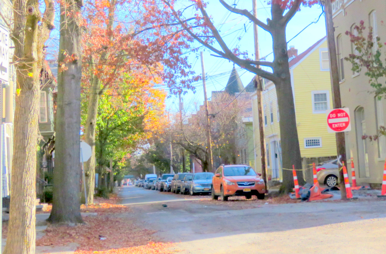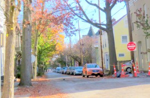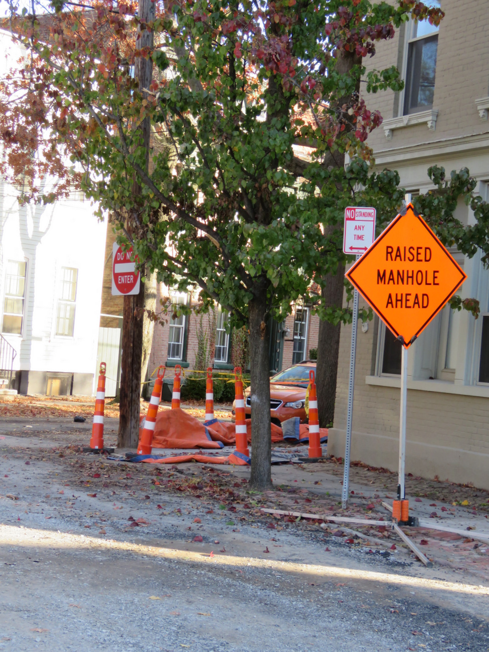 Road work in the Stockade has been going on for a long time, and is not quite completed on Front Street, which needs another layer of asphalt. Runners need to be vigilant for raised manhole covers and grates, as well as the holes shown above. [Click on a square tile below for a full image.]