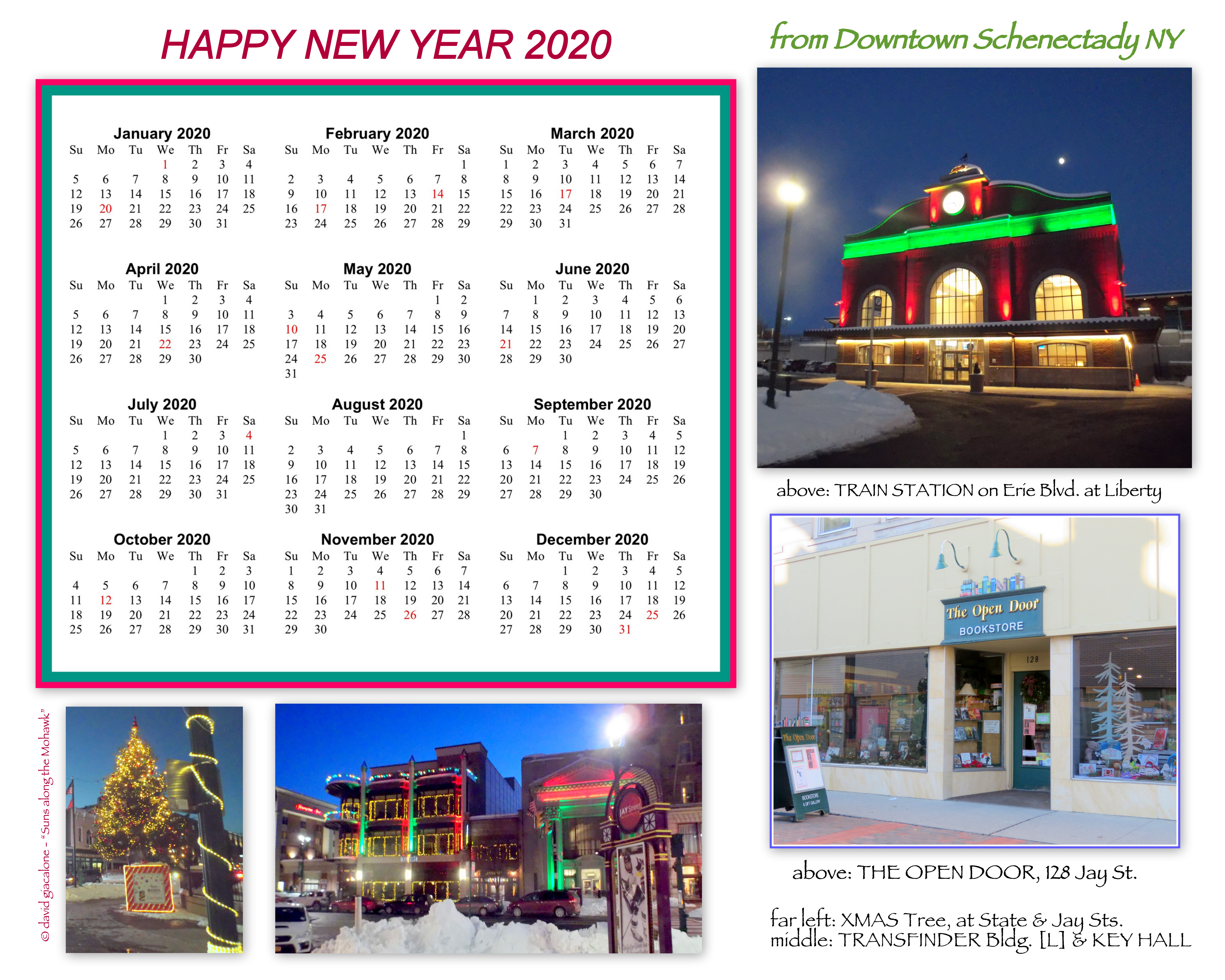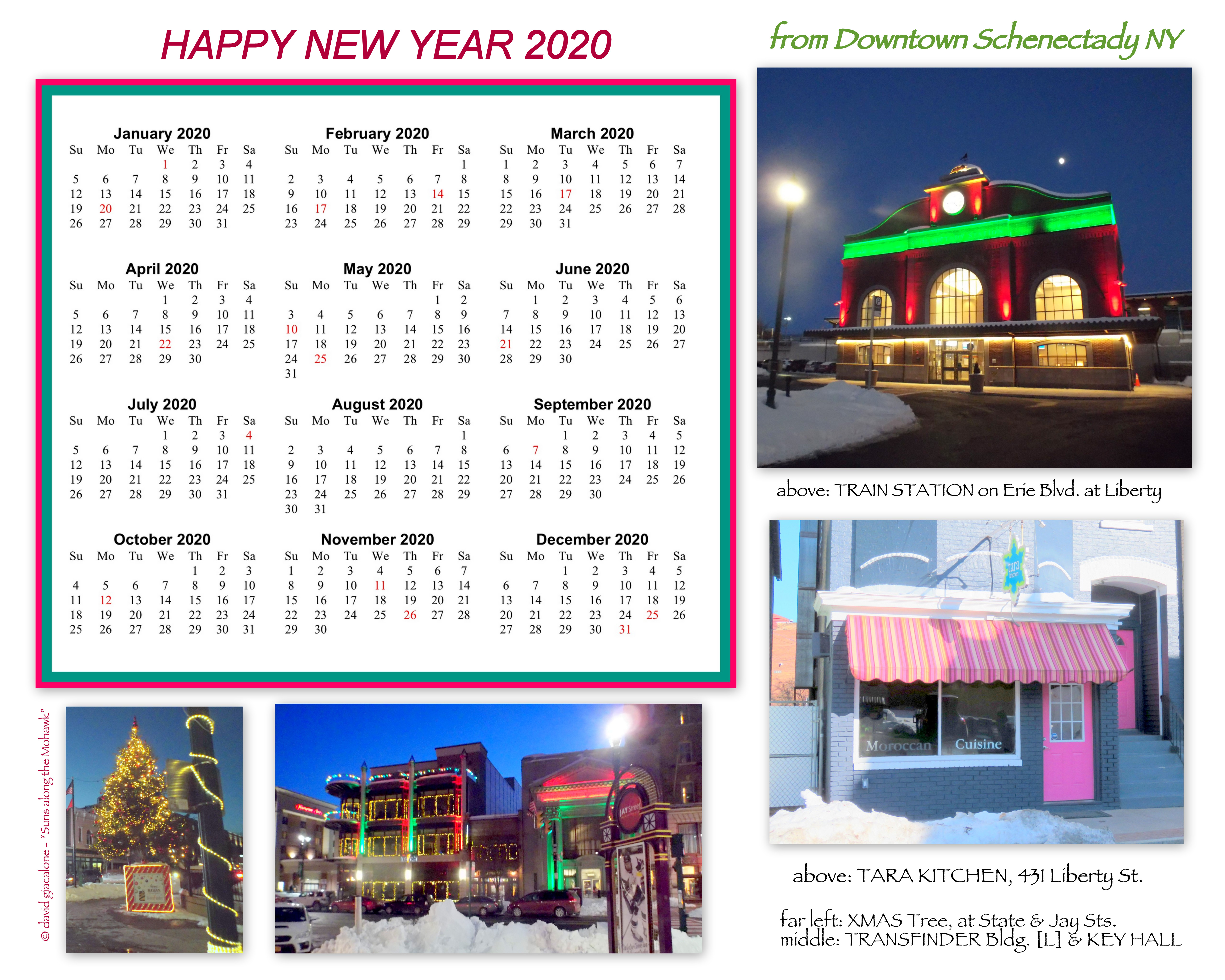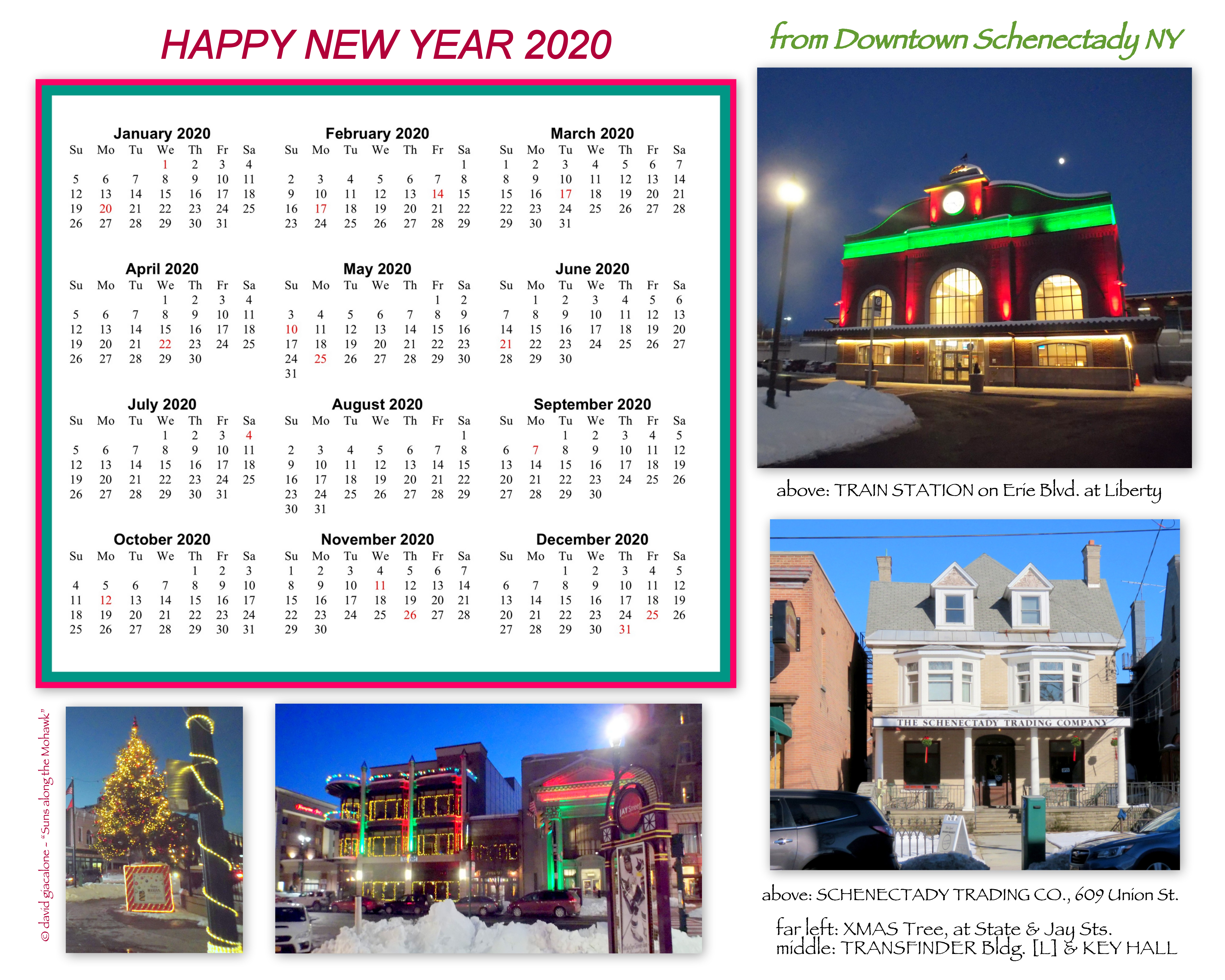 The vision last week of the Train Station highlighted in green and red, plus a desire to highlight some of the good things about Downtown Schenectady, inspired me to put together a one-page 2020 calendar with holiday greetings from Downtown Schenectady. In addition, as presented below, I modified a few to focus on places in Downtown Schenectady that I particularly appreciate.