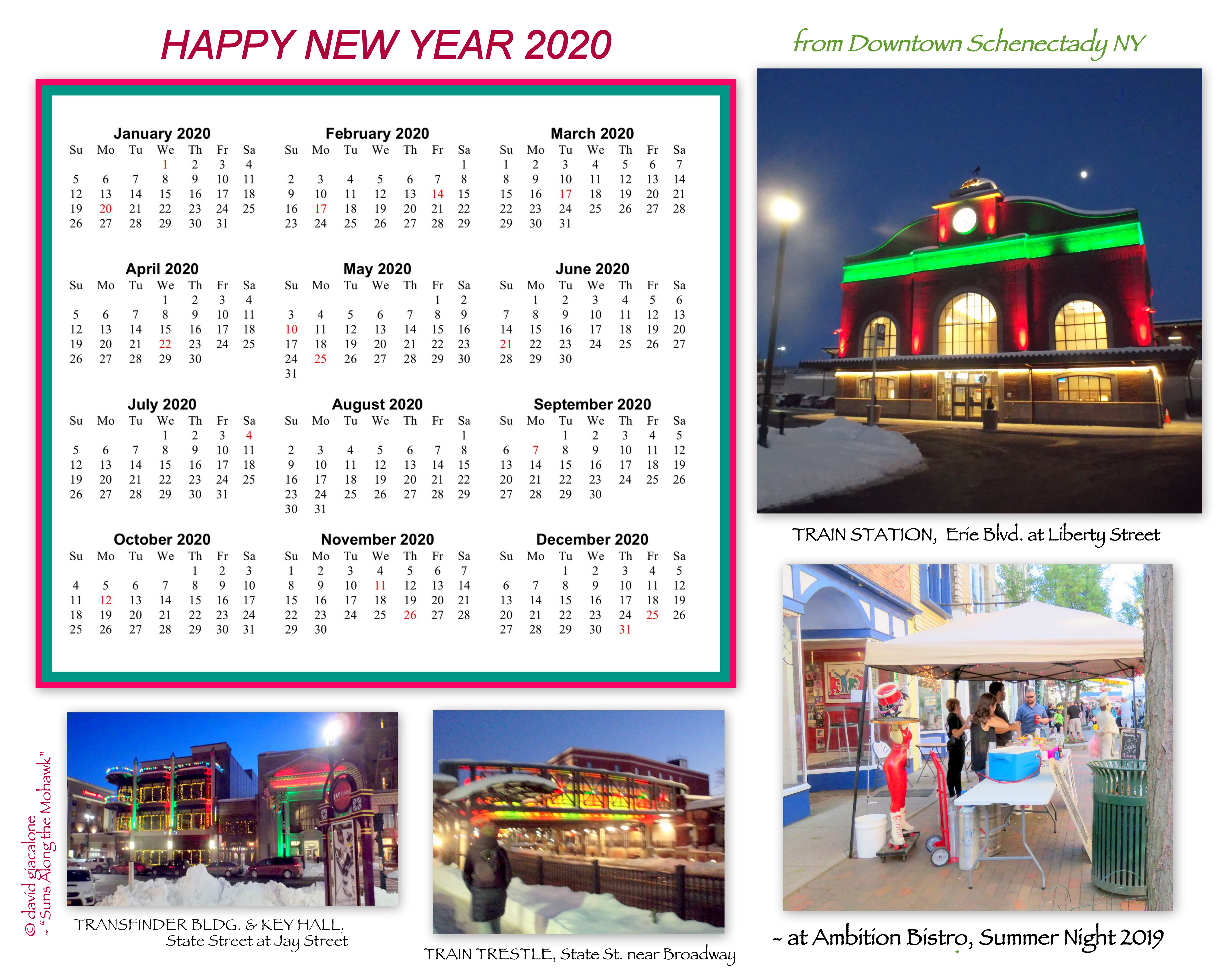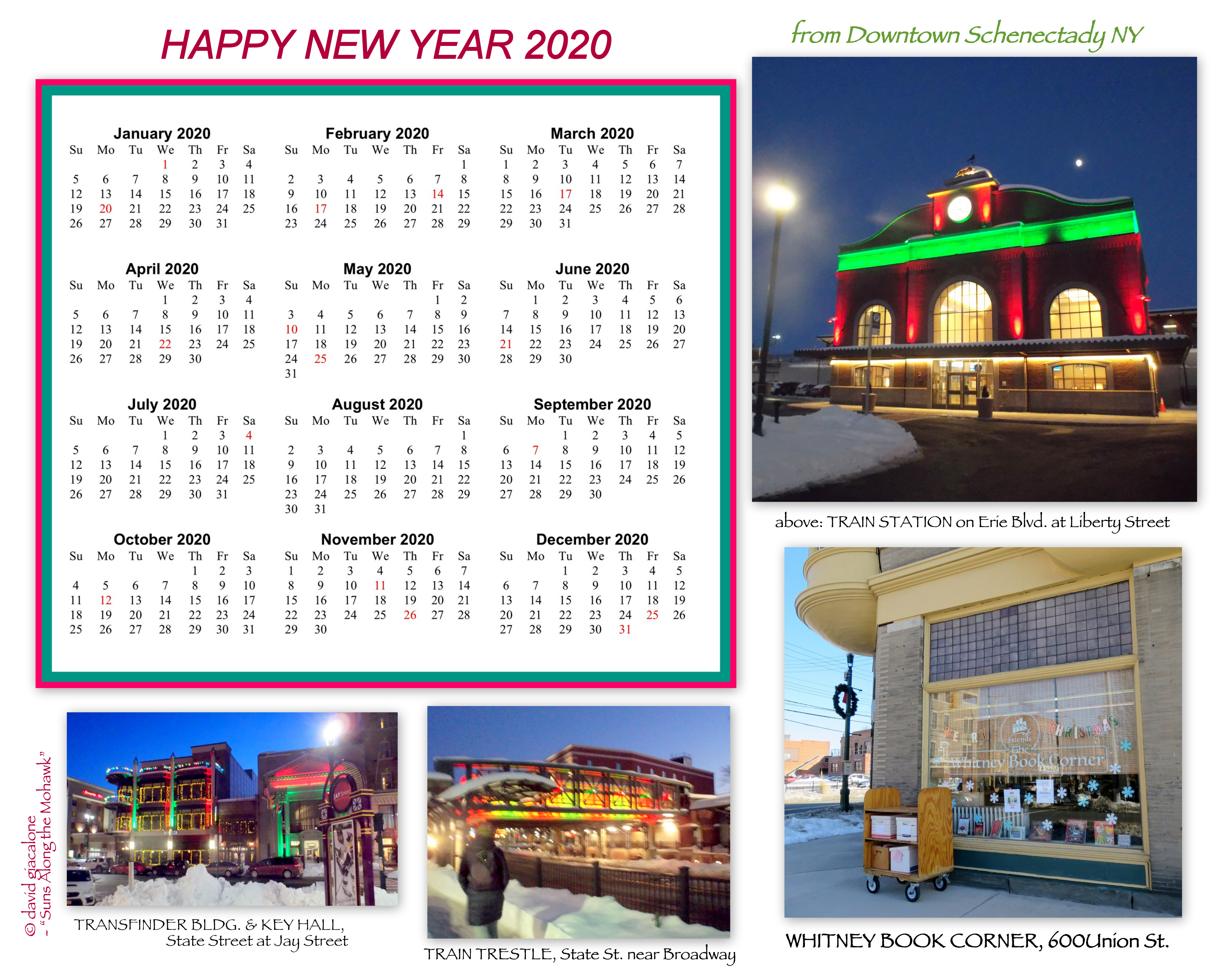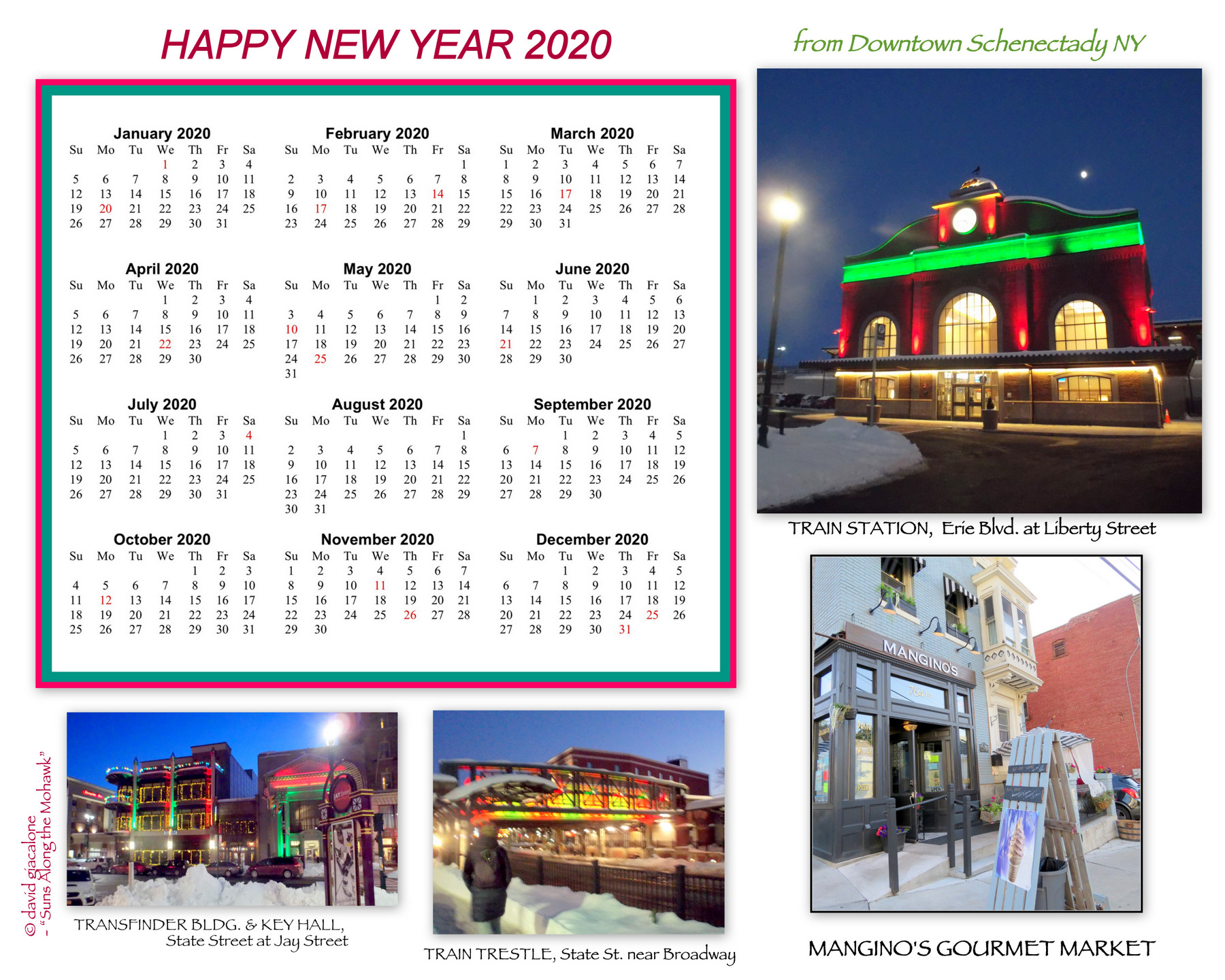 The vision last week of the Train Station highlighted in green and red, plus a desire to highlight some of the good things about Downtown Schenectady, inspired me to put together a one-page 2020 calendar with holiday greetings from Downtown Schenectady. In addition, as presented below, I modified a few to focus on places in Downtown Schenectady that I particularly appreciate.