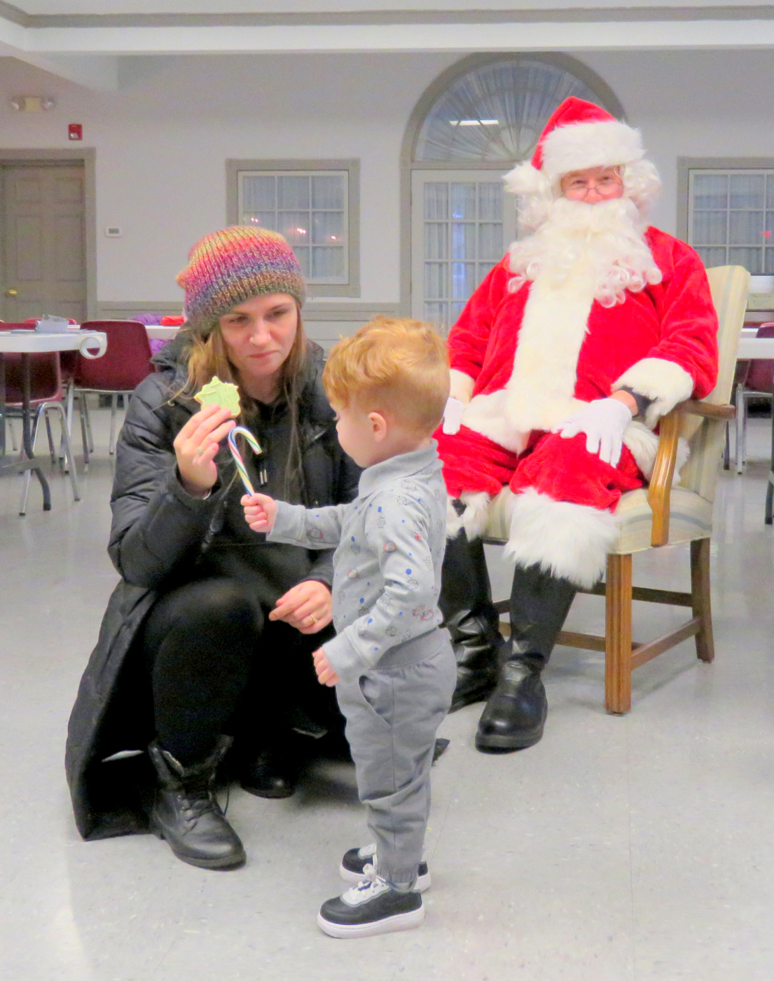 Today, the traditional After-glow Party at St. George’s Great Hall, morphed into a daylight, pre-lighting party, focused on activities for young children. The kids were all delightful [as one observer put if, “well-behaved and cute”; e.g., Xav, photo on the right]. And, there were lots of cookies and sweet things to eat and adults brimming with good cheer. Santa was also in a fine mood and stood out in red among the new white tables and chairs.
