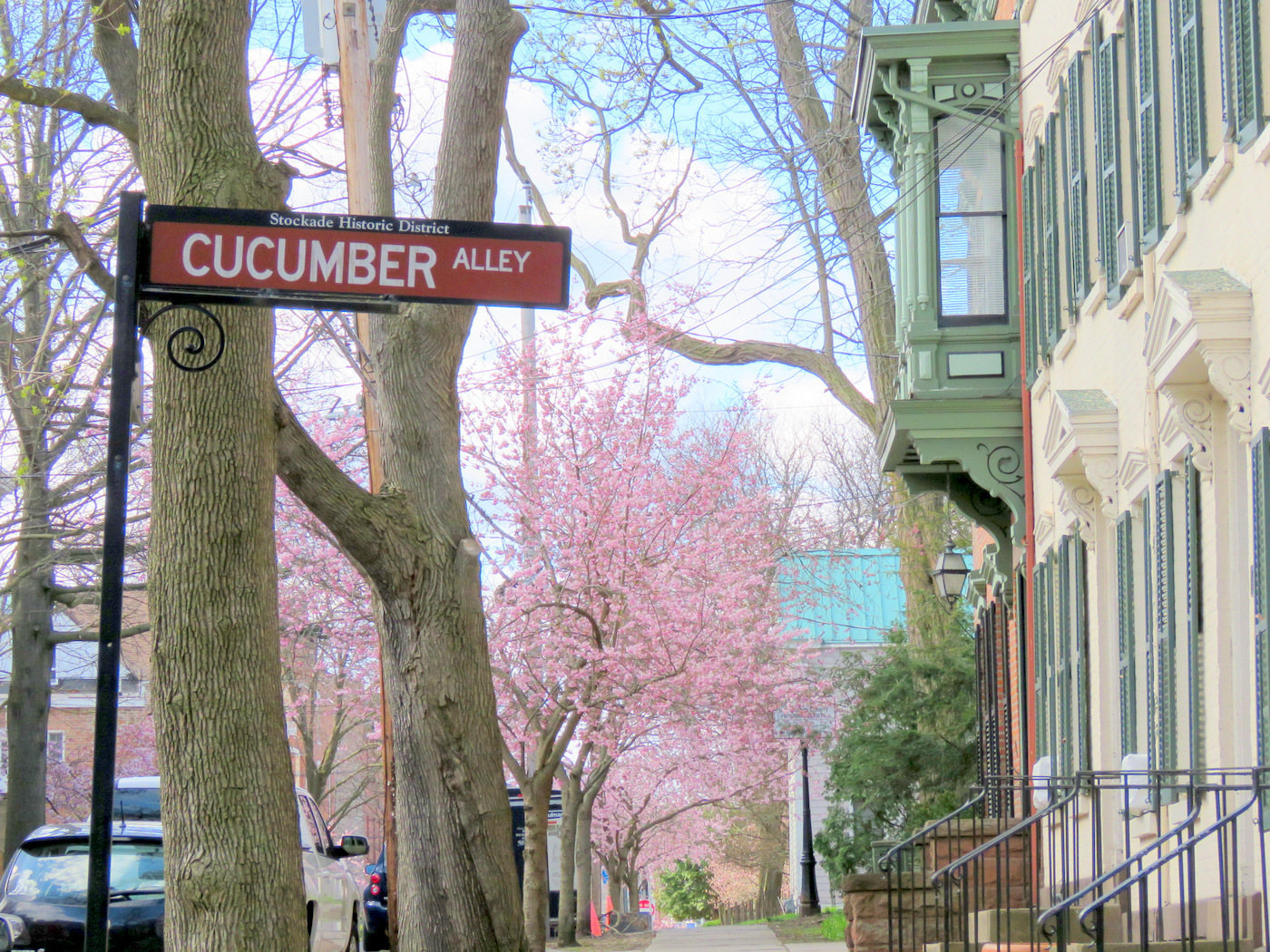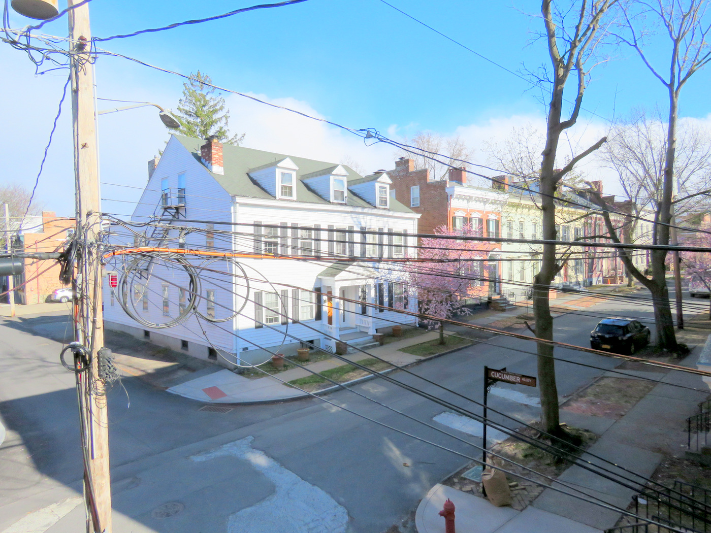Public Service Announcement & Pet Peeve: The mangled mess of utility wires above our Stockade streets (and elsewhere in Schenectady) chronically annoys me. But, never more than when I try to show off our cherry blossoms and have to make believe they are not marring the scene. Our City Hall brags about its connections to the “smart” utilities. Couldn’t those smart brains in our Administration and Legislature join with the utilities to think of ways to wire our City in a far less obtrusive and more attractive manner? And, note that the lower the wires are strung the more we lose the tops (and centers) of our trees, even the cherry blossom trees.- p.s. This is a view of some of the wires directly out my second-story bay window at Cucumber Alley.