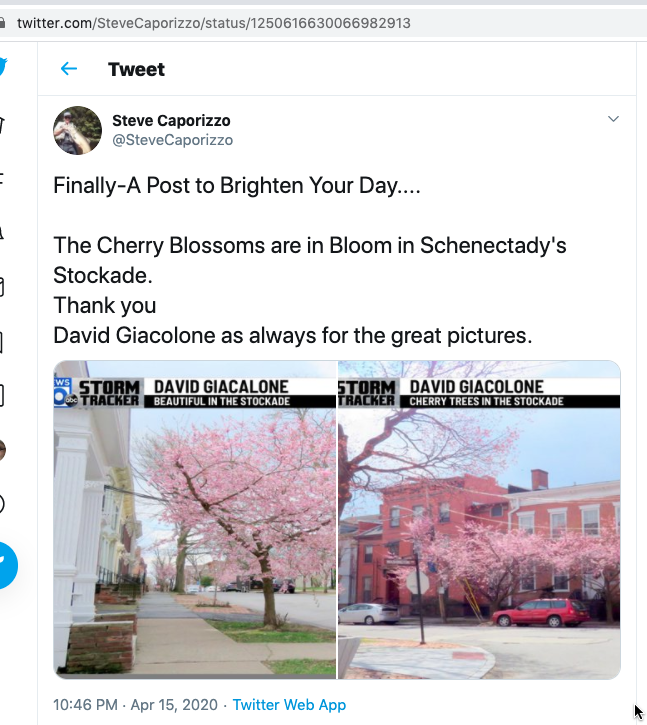 Finally, sincere thanks again this year, to chief meteorologist and Pet Connector Steve Caporizzo at News Channel 10 [WTEN] for spreading the good news of Stockade cherry blossoms to his many fans.