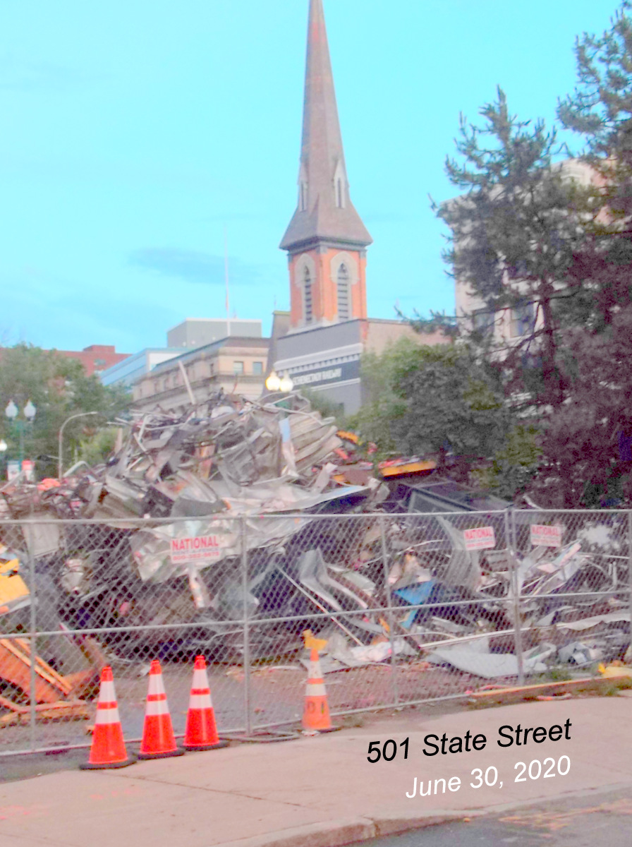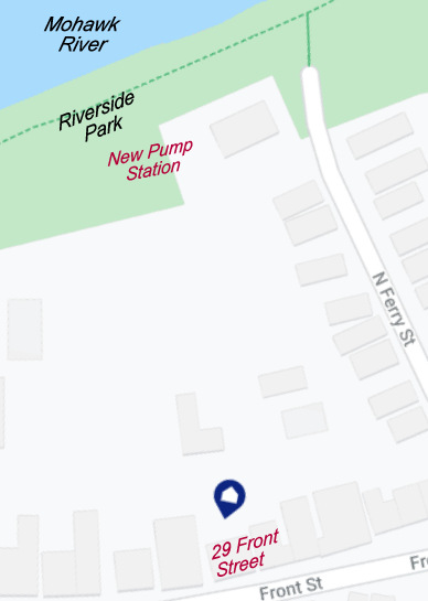 Merely looking at the photos I took during July 2020, you wouldn’t know the month occurred during the COVID-19 pandemic. The scenes of the Stockade and Downtown Schenectady were as colorful, inspiring, and diverse, and occasionally as aggravating, as ever. The map at the right shows that the beautiful sunflowers seen above, street-side at 29 Front Street, are just a stone’s throw from the Riverside Park construction site of the often-dispiriting and disruptive new pump station project, until recently the site of a grand, century-old shade tree.
