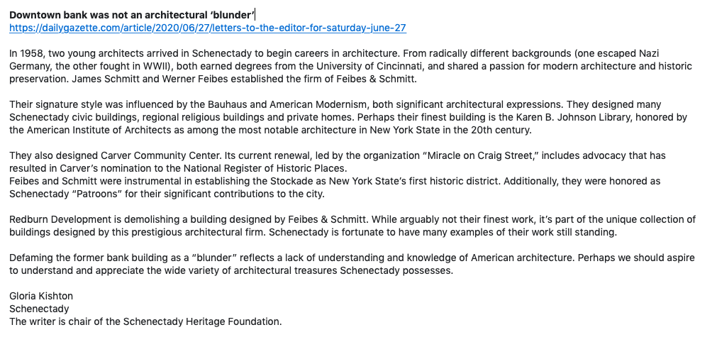 Many thanks for this interesting history of the Lorraine Block. I probably would have been at the forefront of advocating for the Lorraine Block to be preserved in 1972, but, alas, I was in college at the time. Generally, I think Mid-century Modern architecture is under-appreciated; perhaps it’s not old enough yet. It also occurs to me that if the Albany Savings Bank building had been turned 90 degrees, with the slanted atrium facing State St. it would have received more admiration. The fact that Feibes & Schmitt Architects were nationally recognized for design excellence should make Schenectady proud to be home to so many of their buildings. As a collection, I believe their importance will only grow over the coming years.