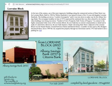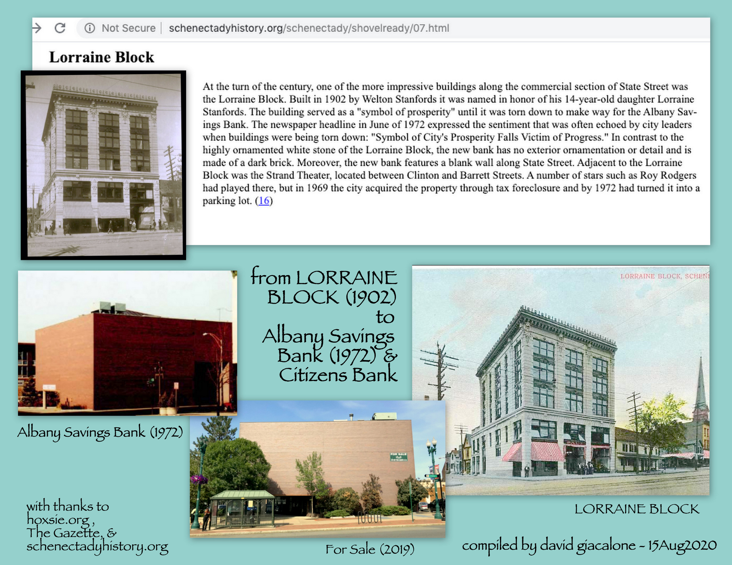 “[It] went into bankruptcy in 1971 and came to an end in 1972, when the Albany Savings Bank bought the Lorraine Block, the former Illuminating Company building, and the site of the former Strand Theater [BARCLI] to build a branch office. By then, the Lorraine had fallen into the state of shabbiness that prevailed in downtown Schenectady at the time, and it must have seemed that any sort of modern building and new business was a welcome improvement.