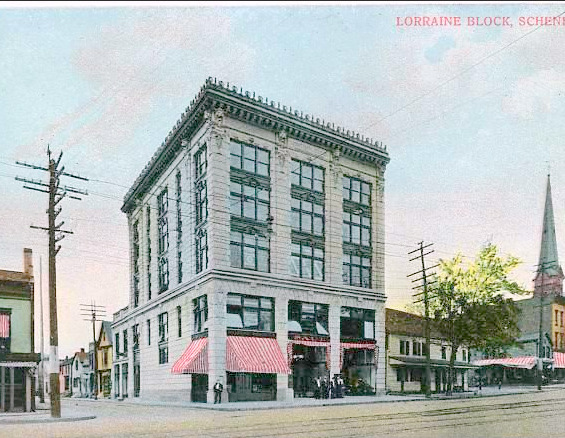 For decades, the Lorraine was a premier business address. The Hoxie article by Carl Johnson gives a history of its sales and tenants, including quotes from Larry Hart. Despite a foreclosure in 1940, the sale in 1944 of the Lorraine Block, 505 State Street, made news as the “largest transaction of its kind in Schenectady in many years.” Hoxsie.org also adds details about its original owner, Welton Sanford, and his prominent family.