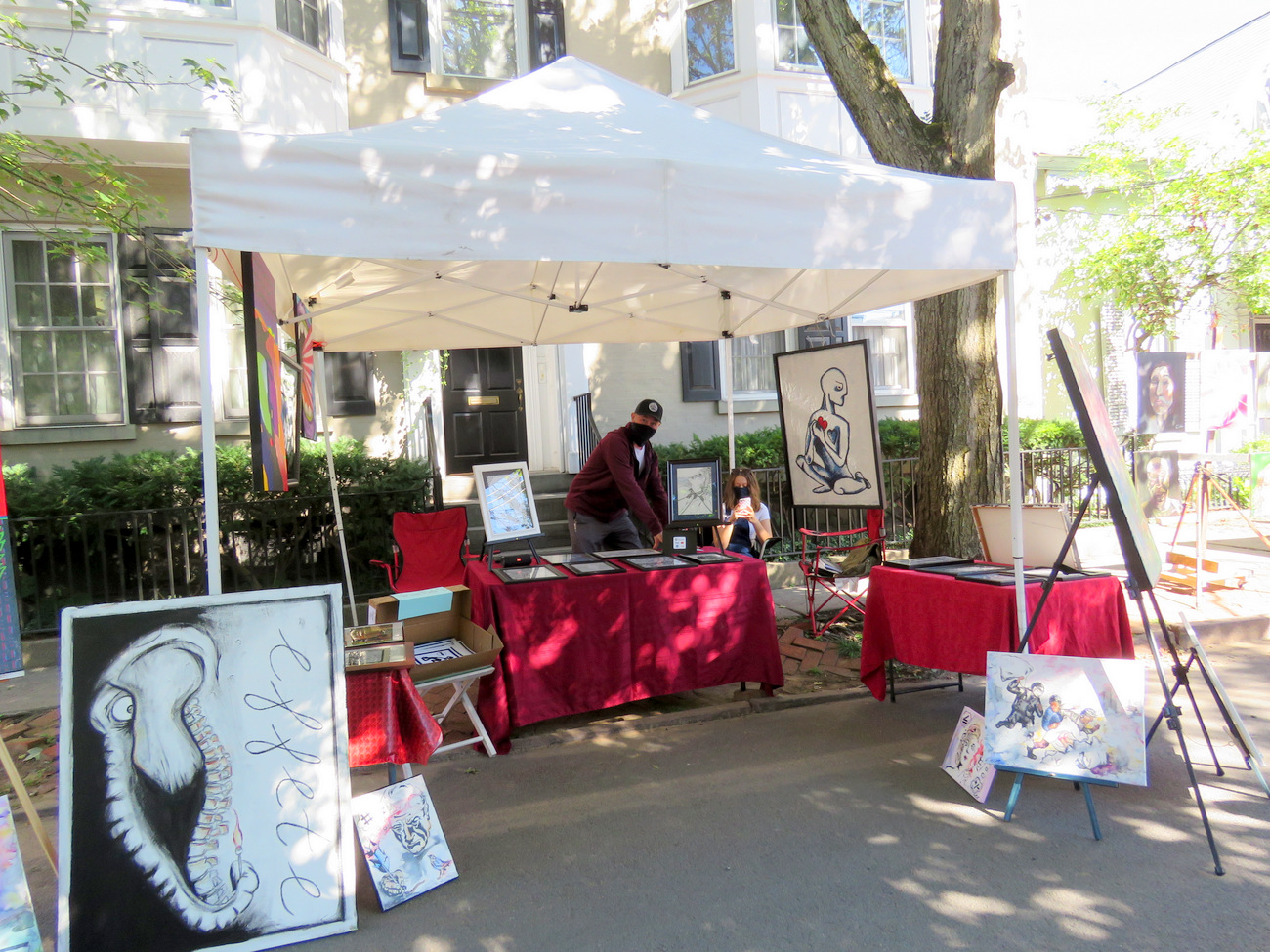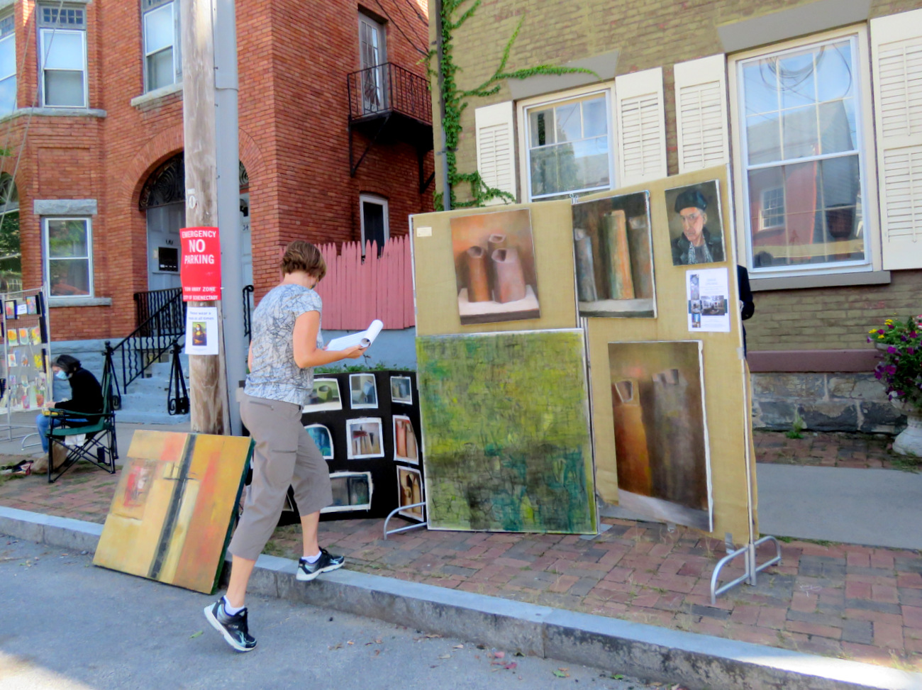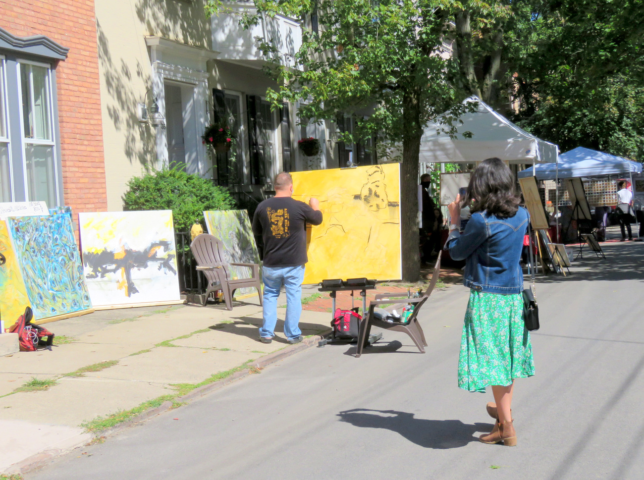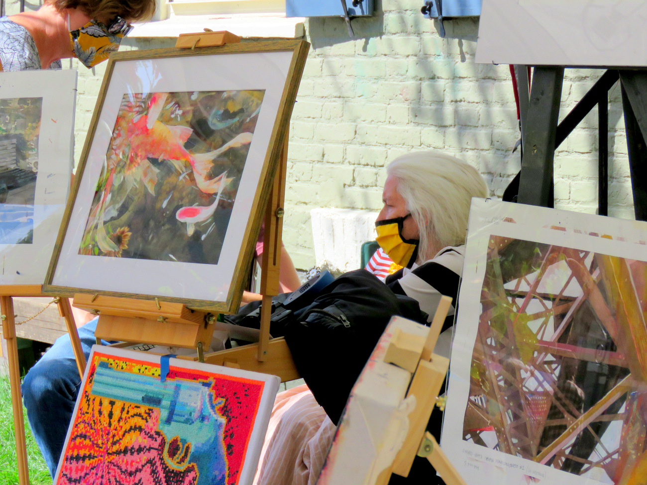 Today’s 69th Annual Stockade Villagers’ Outdoor Art Show had special COVID-19 pandemic rules and procedures. Organizers and fans wondered whether the lack of registration, judging and awards would keep artists and patrons/browsers away, with a backdrop of virus-fueled agoraphobia. Well, we did not have to worry. Gorgeous weather, a palette-full of artists, and a robust number of masked visitors made the Show a bright success.