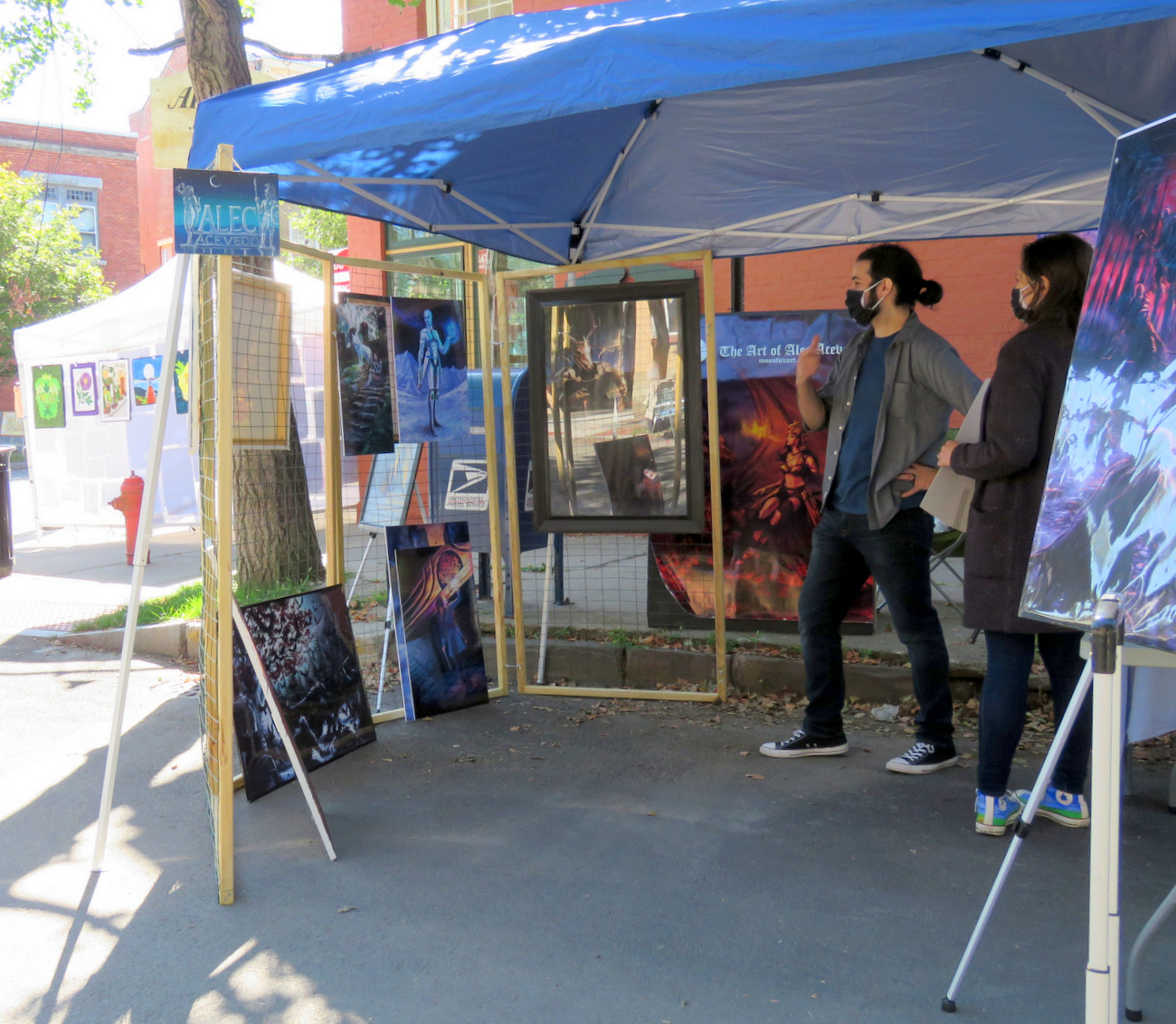 . . Alec Acevedo was back alongside Arthur’s Market on Front Street [L], accompanied this time by a colorful exhibit of pieces produced by his parents [R] while sheltering at home during the pandemic.