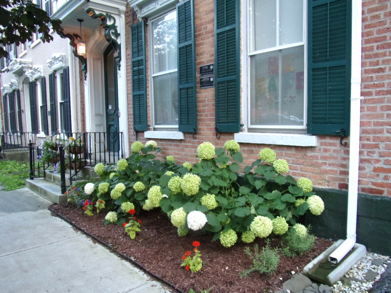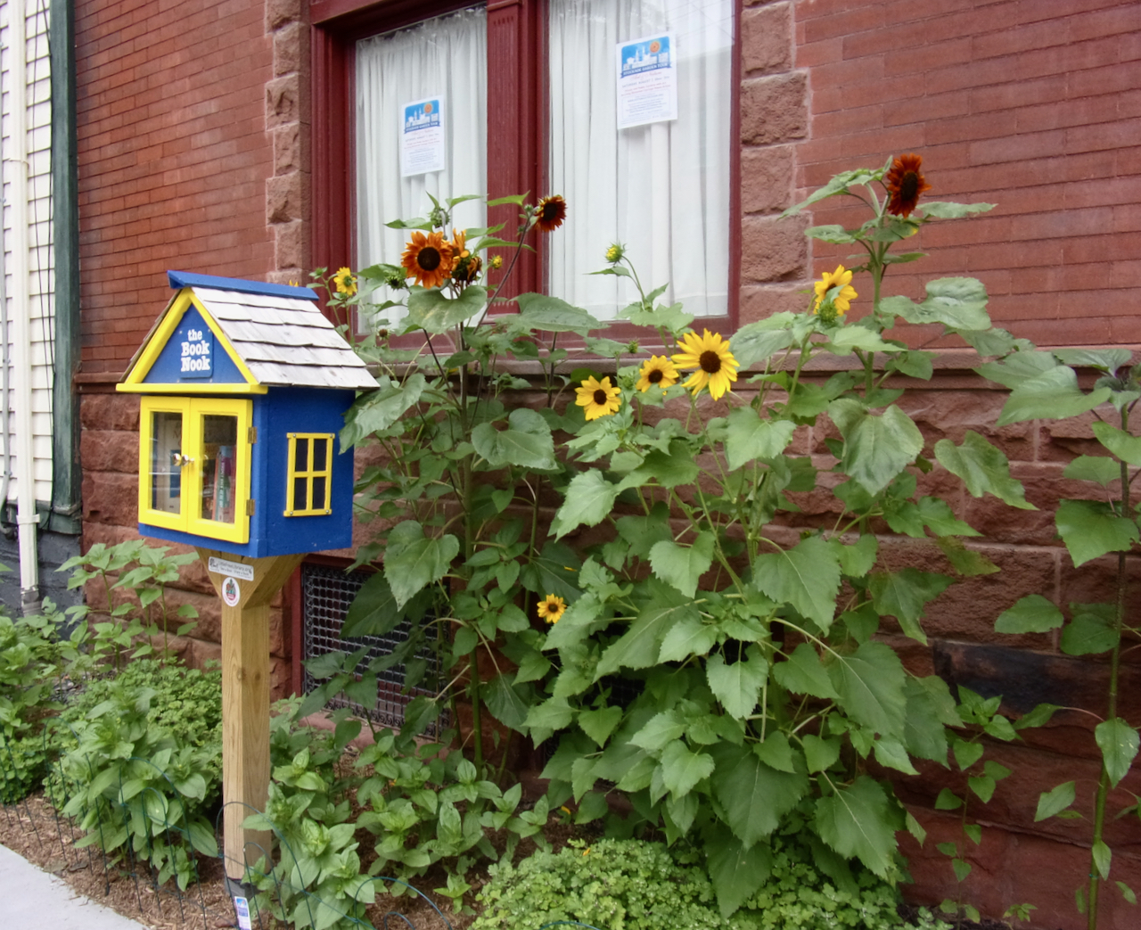 Across from the hydrangeas at 214 Union Street stands Bob Lemmerman’s much-admired Little Lending Library (blue Book Nook), standing stoically while steadily encroached upon by Gloria’s colorful blooms: