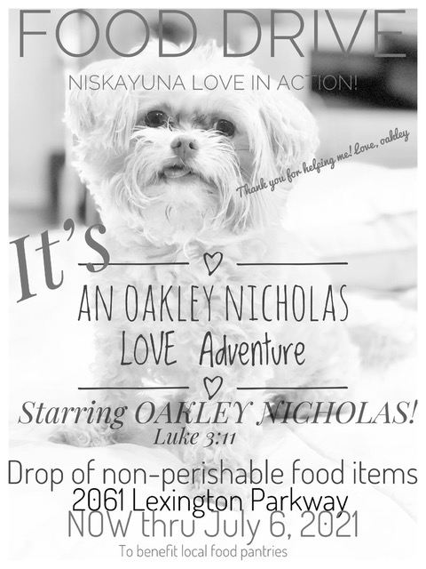 While most of us spent Independence Weekend in leisurely pursuits, former Stockade good doggie, and Instagram Star, Oakley Nicholas was working hard at his Niskayuna Love in Action Food Drive. [poster on left by S. Lauren] When I arrived in the early evening of July 4 to drop off non-perishables, Oakley was fairly worn out from being a celebrity fundraiser all day. Lucky for him, Oakley is always in the good hands of his mommy Stacey Lauren, who also spent many years living in the Stockade: