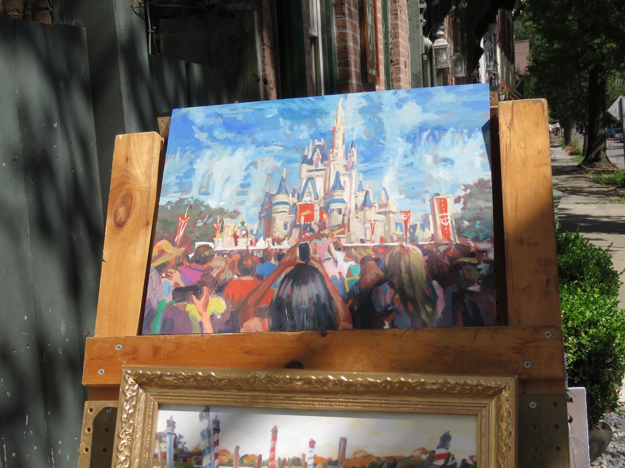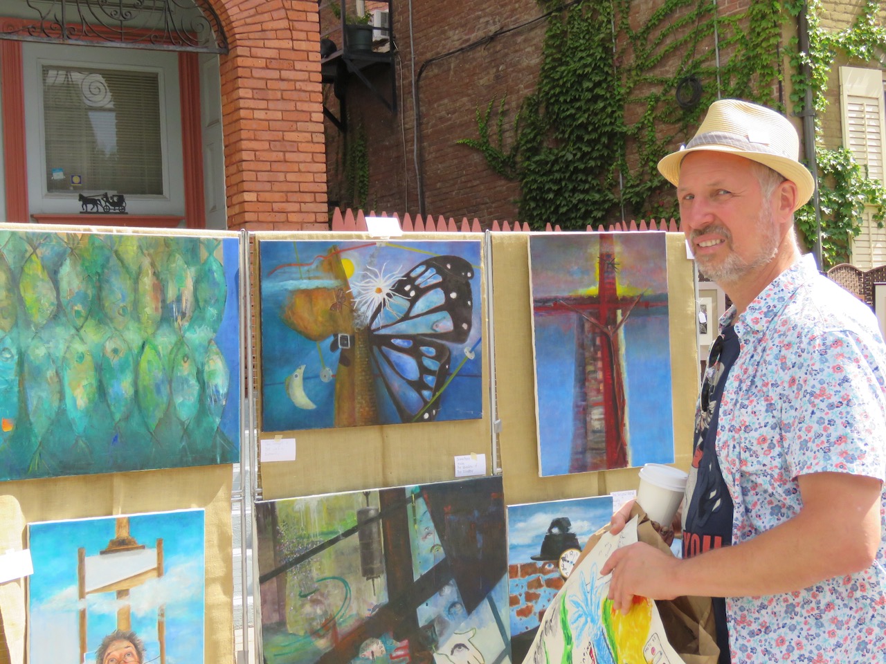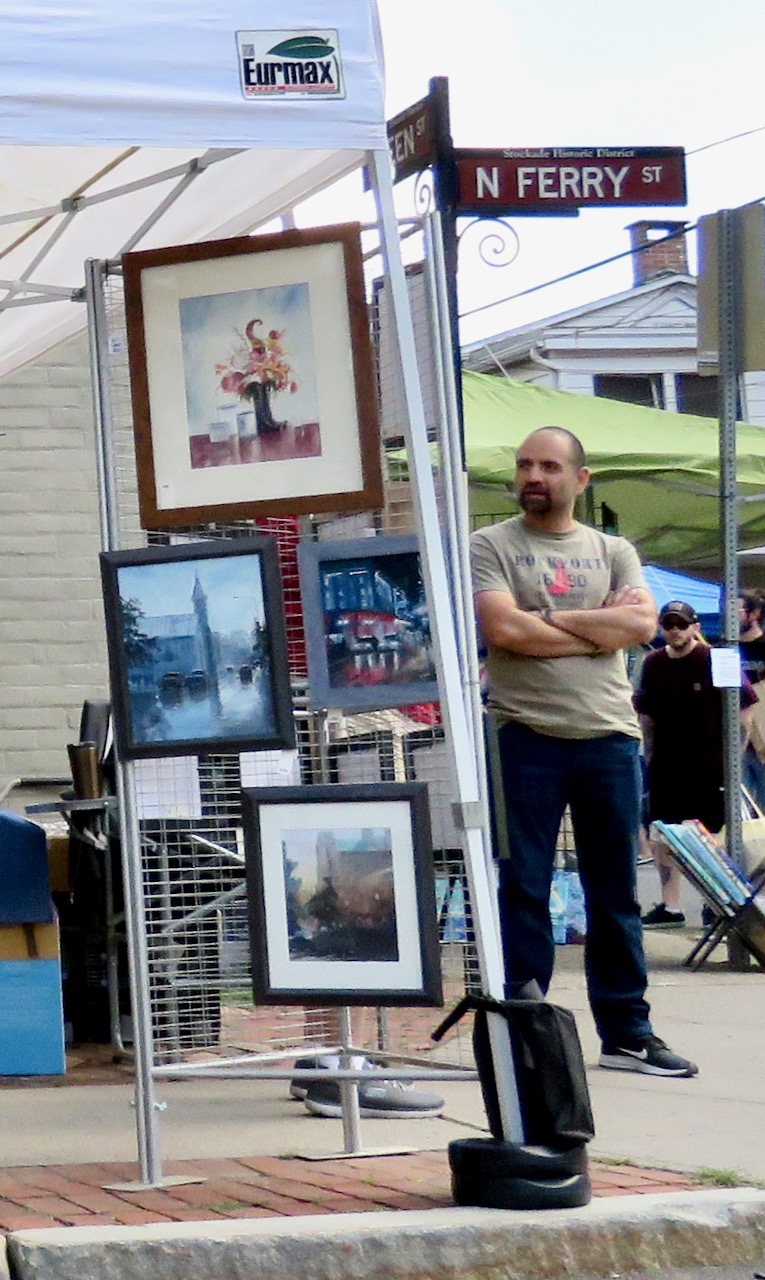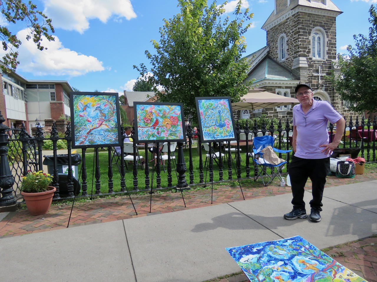 Have I mentioned that the blue sky, clouds, and sunshine greatly enhanced my enjoyment as a photographer and browser? Add the St. George’s steeple (e.g., see photo at top of this posting) and the warm welcome and vibrant colors of returning artist Mark Miletta, and I could scarcely ask for more. (see painting to the left and the scene below)