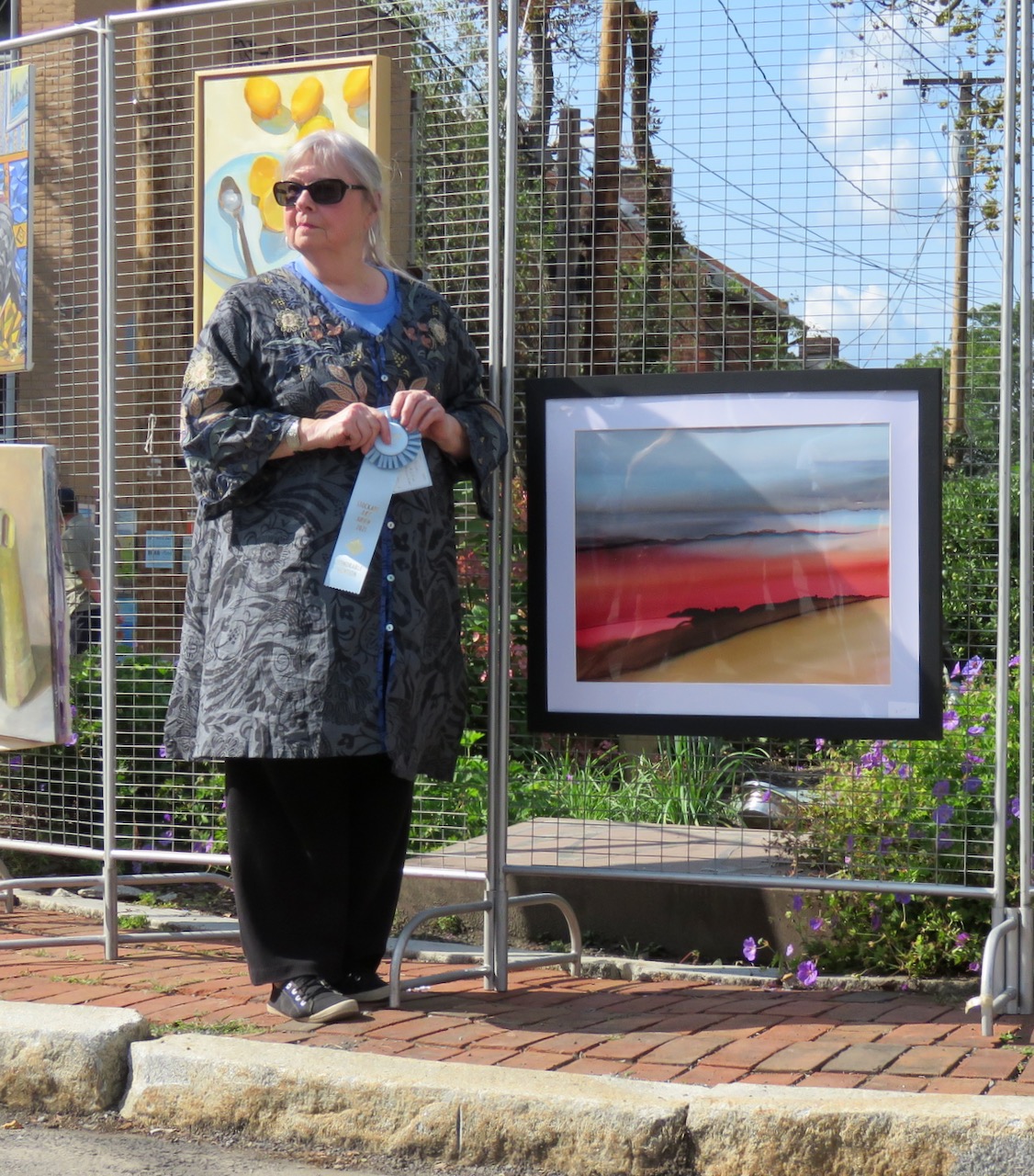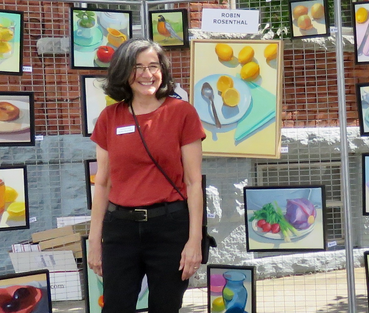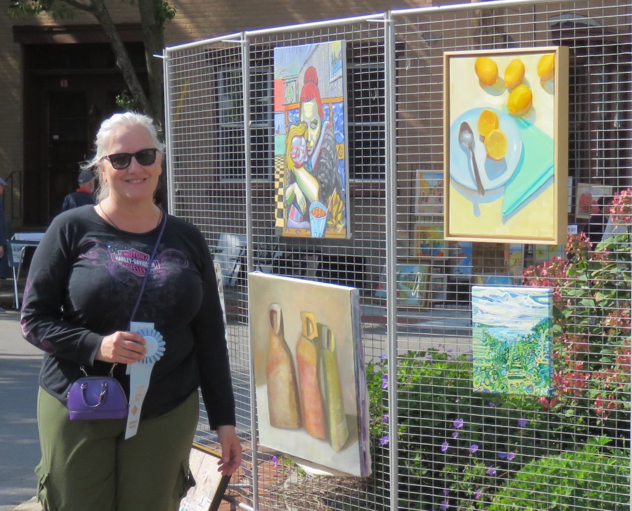 As I came back to North Ferry from Green Street, heading south, I was happy to see that the renovated Arthur’s Market 1795 is a bustling part of our neighborhood after years without an Arthur’s. The new pickup window has become a favorite place to meet well-loved doggies (above left). And, I perked up literally bumping into Robin Rosenthal, one of my favorite returning artists — for both art appreciation and schmoozing. (above right) Later, she had good reason for that big grin seen to the right, as her lemons earned the Show’s 2nd prize.