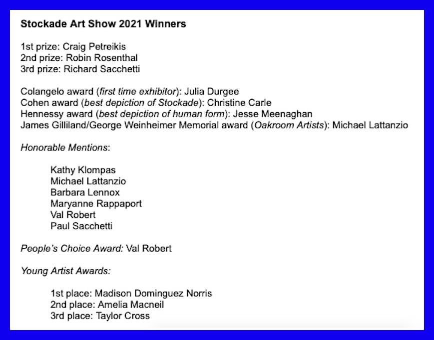 As always, my thanks go to the Committee that organized and executed the show, and to artists, neighbors and visitors to the 2021 Stockade Show.