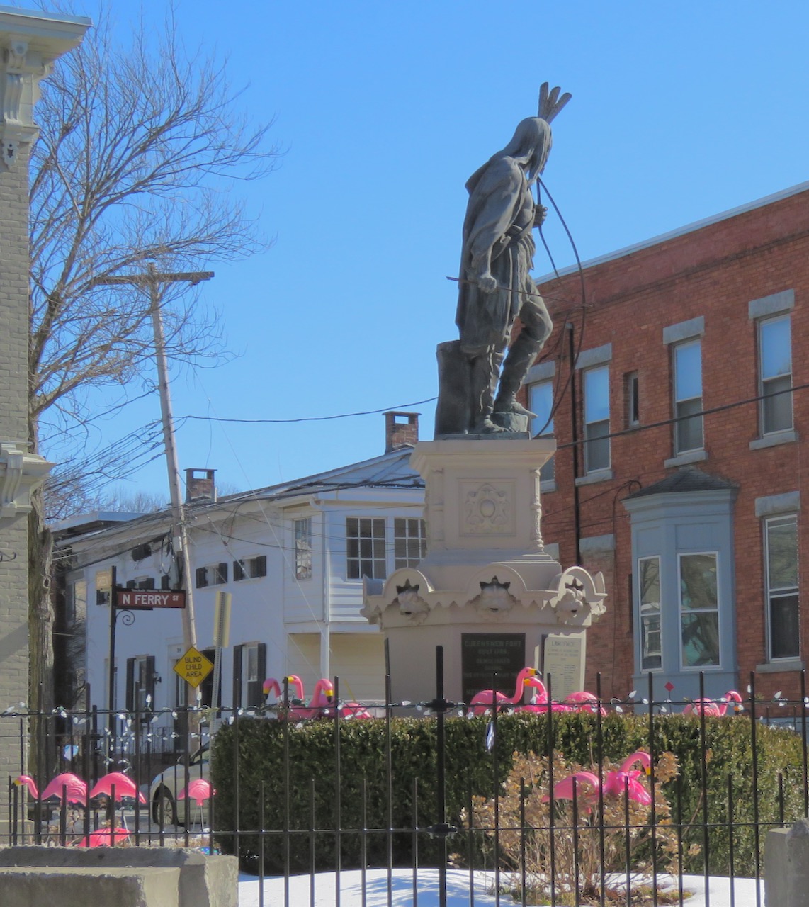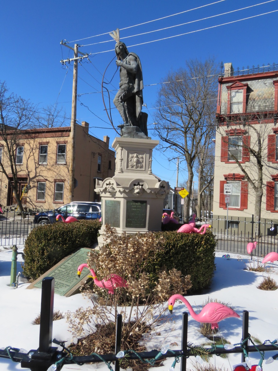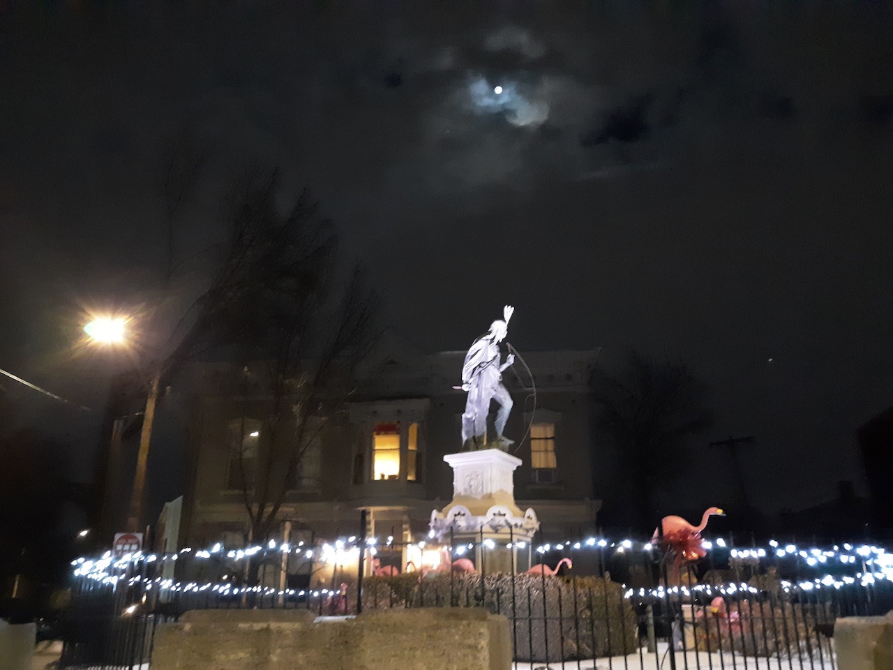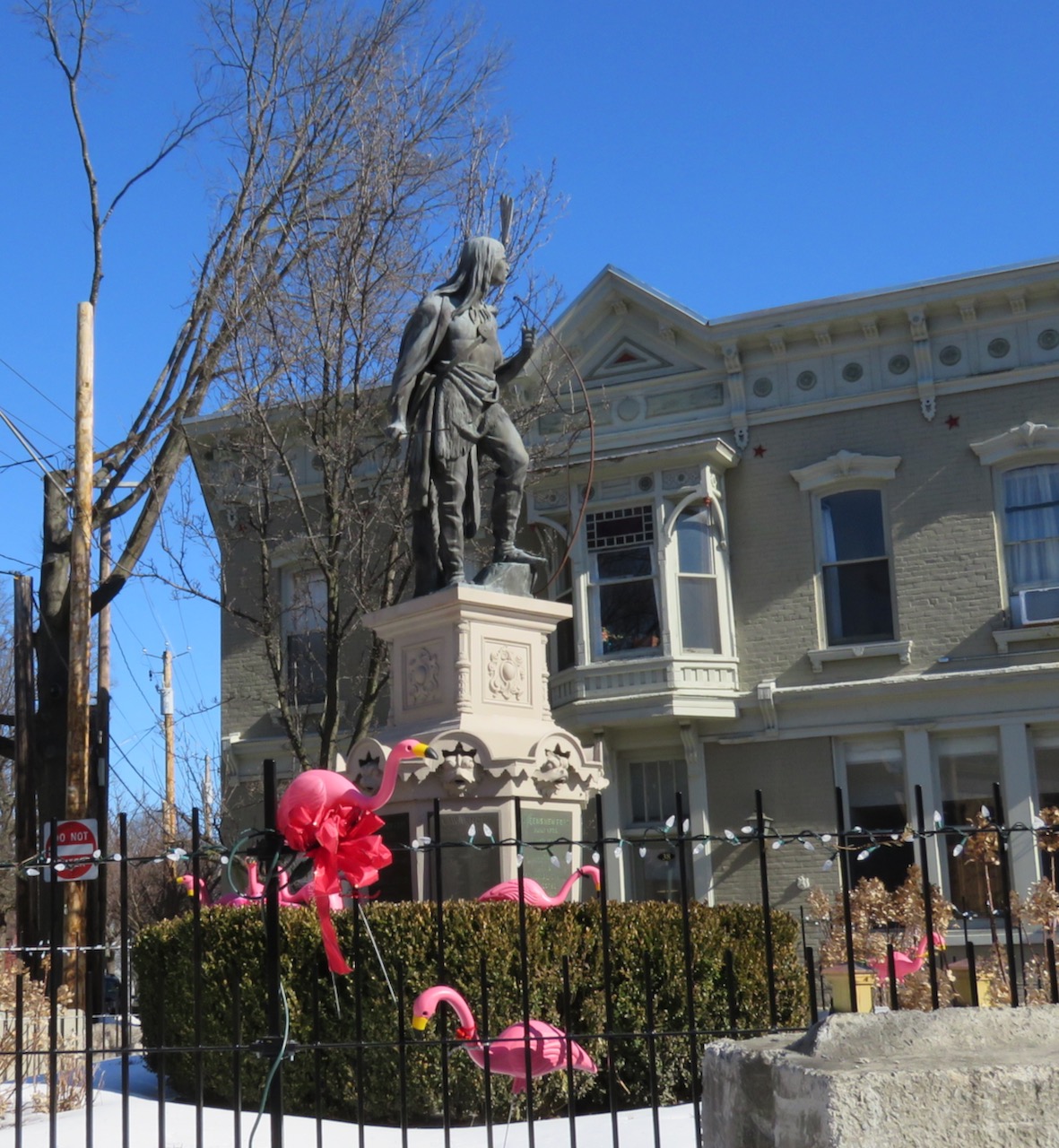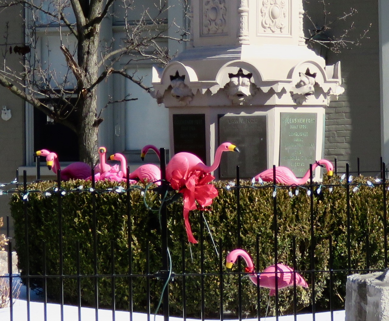 This year’s flamboyance of Valentine flamingos arrived February 13 at Lawrence Circle early enough to catch the Super Bowl game. They found a quiet Circle under an almost-full waxing gibbous moon.* The flamingos will be visiting Lawrence here in the Schenectady Stockade until after dark on Valentine’s Day. It will be cold but sunny under blue skies for the brief flamingo visit on February 14, which should mean lovely selfies and other photographs for fans of romance and whimsy at Lawrence Circle.
