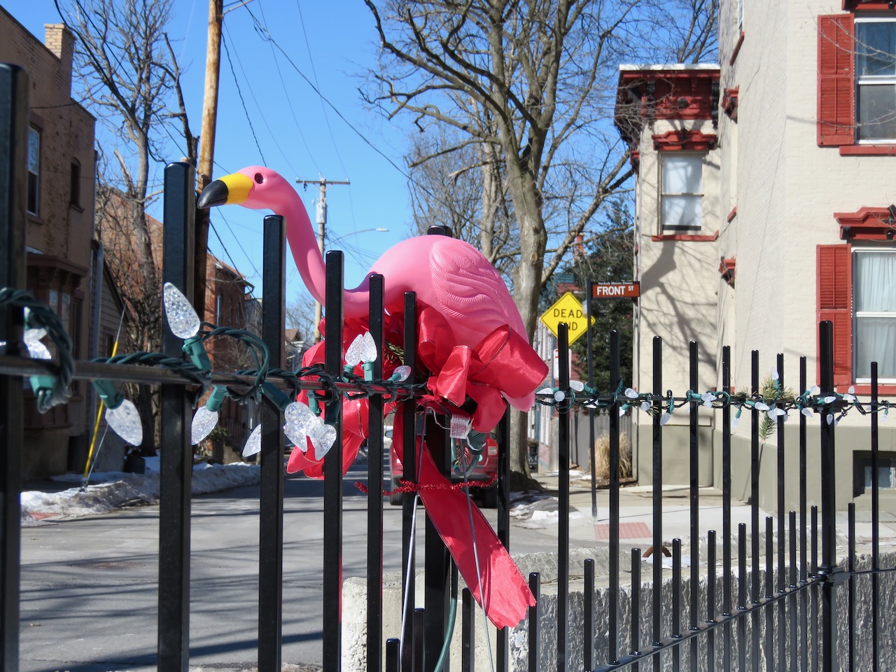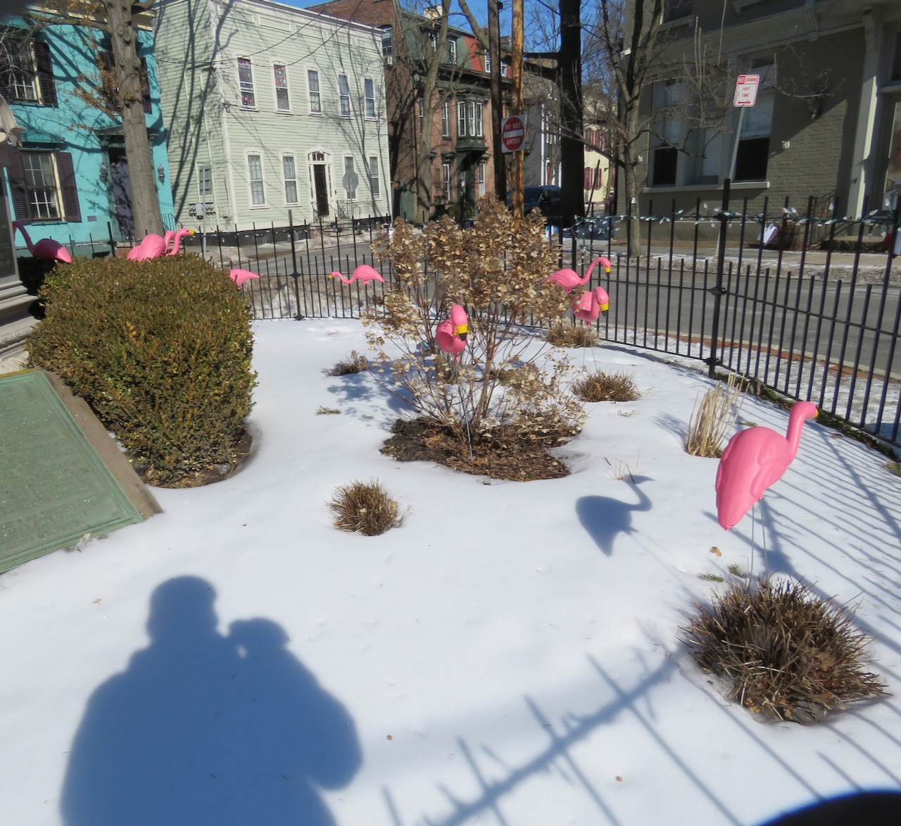 follow-up (February 15, 2022): Our good friend, meteorolgy maven Steve Caporizzo at NewsChannel10, featured our Stockade Valentine Flamingos again this year. See his Facebook Flamingo posting last night. Here is a link to the video segment – https://www.youtube.com/watch?v=8yErIyVf4ag