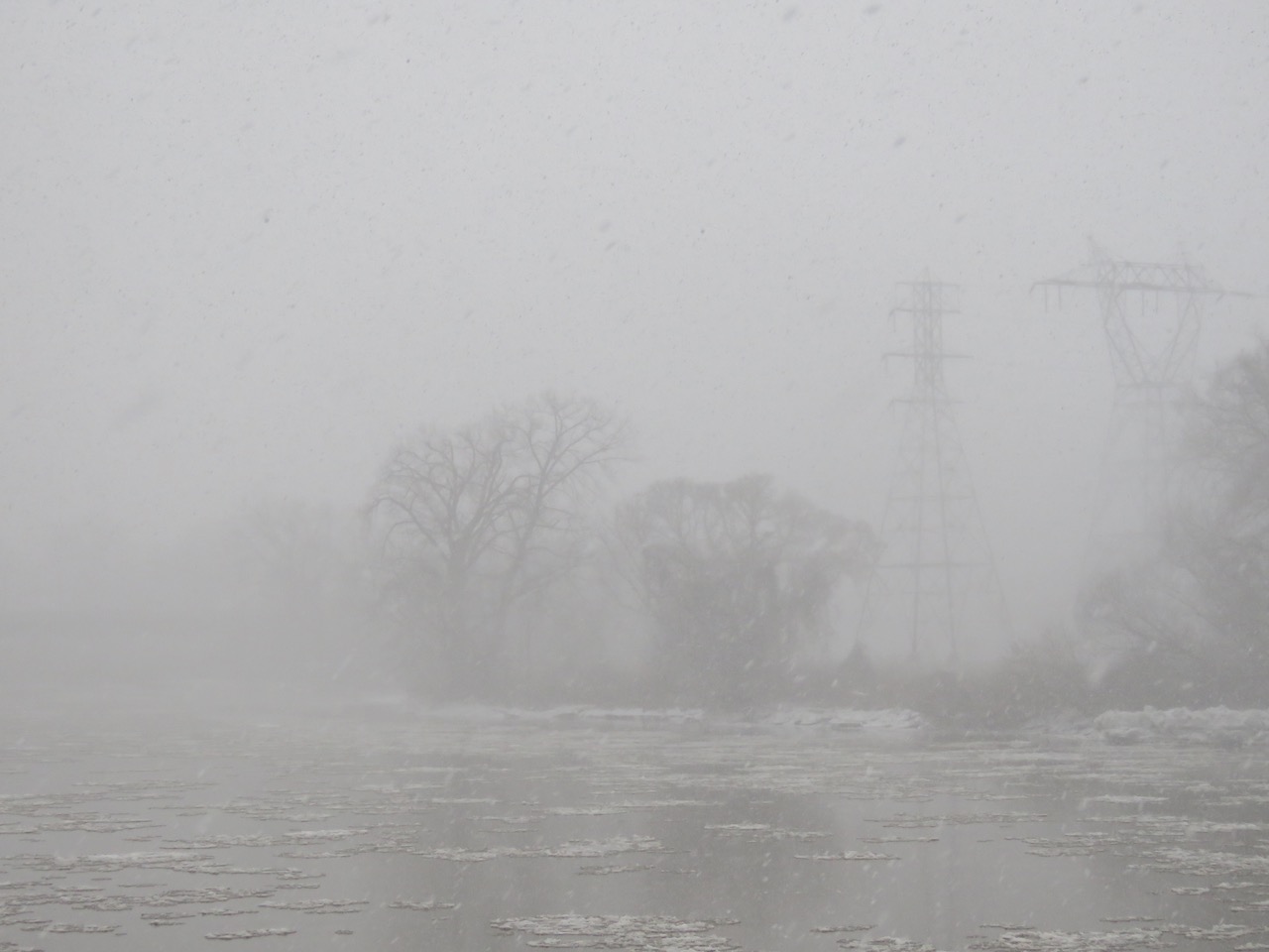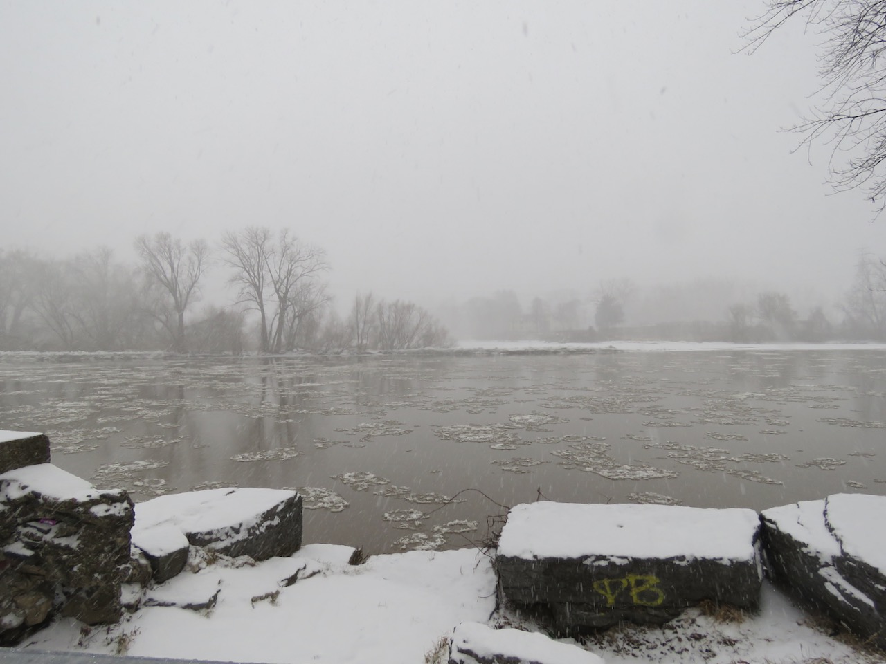 Highs winds and low temperatures greeted anyone heading to Riverfront Park on Saturday. The image on the left shows the Mohawk as seen from the deadend of Washington Avenue at about 11:43 AM. A half hour later, just as I was thinking the Region’s forecasted snow squalls were not going to hit Schenectady, a neighbor pointed behind me toward Scotia. This is what I saw at 12:13: