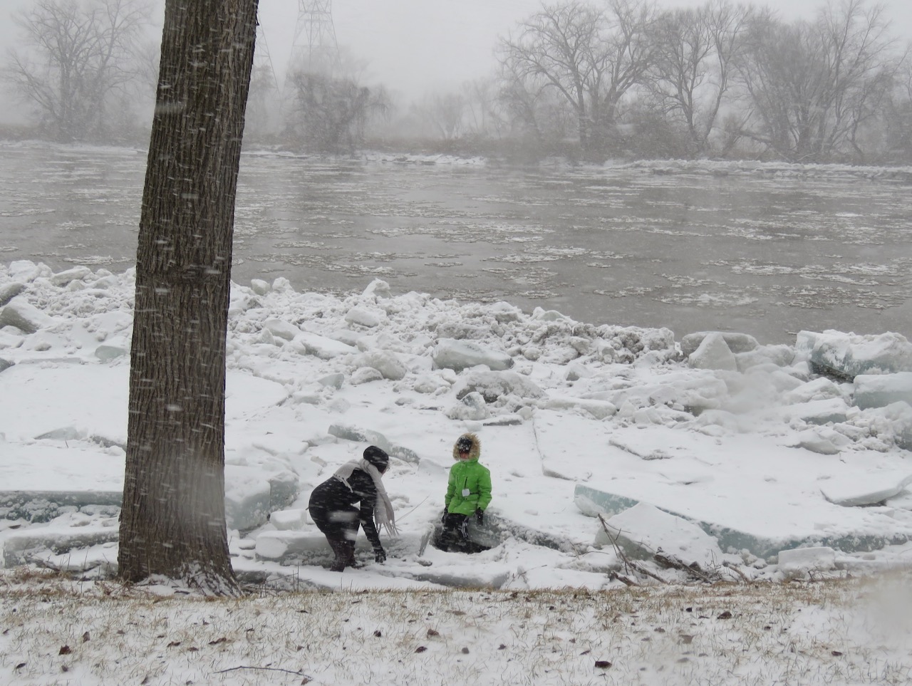 I was warmed at the end of a very cold photoshoot, when I discovered the Galligans (mother and son) frolicking, despite winds and snow squalls, on the ice floes that had landed on the Riverbank along Cucumber Alley and Washington Avenue.