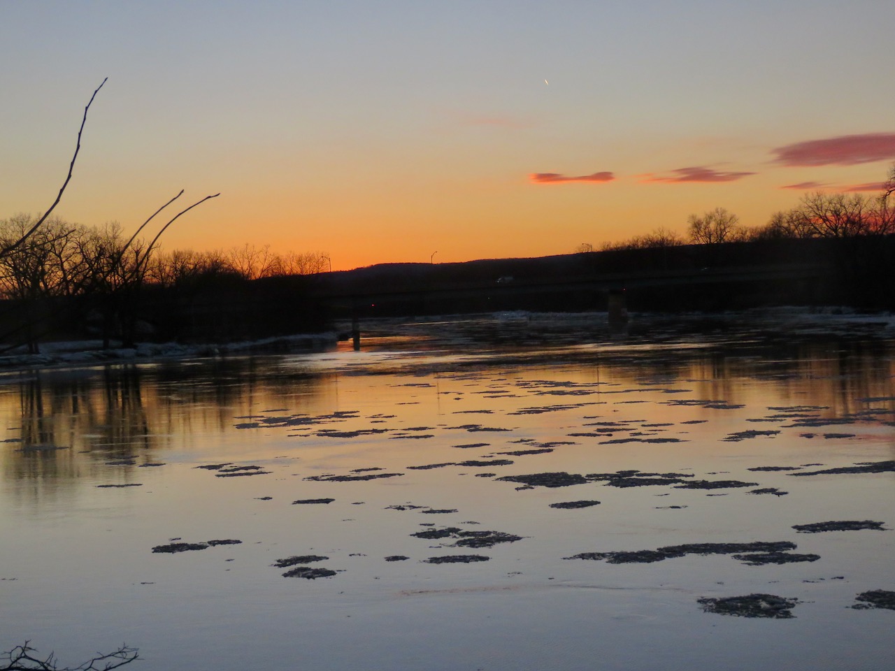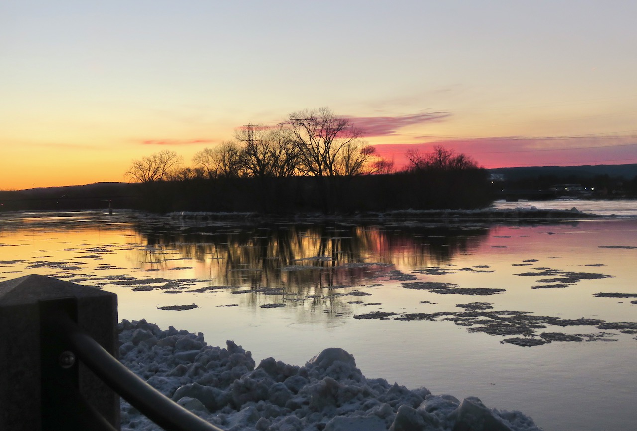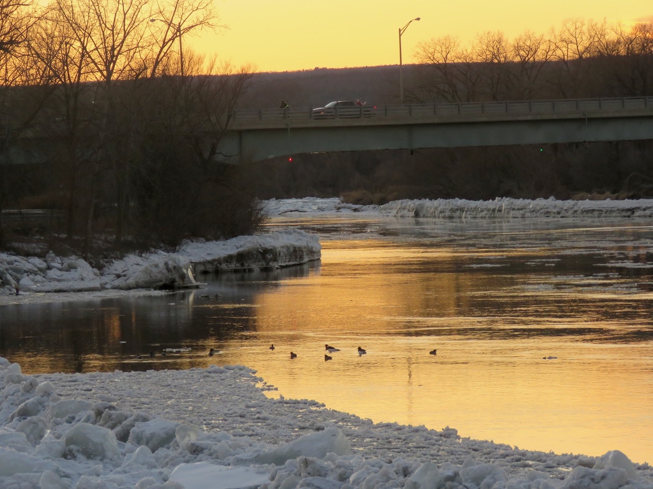 The weekend ended with a lovely sunset along the Mohawk, Sunday, February 20, 2022. On the right, the Isle of the Cayugas with a pink and yellow glow in the sky and River, viewed from the west end of Riverside Park. A small family of mallards (I think) were seen relaxing in the same yellow glow, at the mouth of the Binnekill Creek, as it flows into the Mohawk: