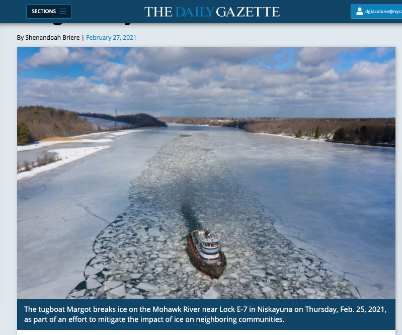 It looks like the use of the Tugboat Margot as an ice breaker on the Mohawk, broke up the ice that topped the River sufficiently to prevent floes climbing the Riverbank and any flooding. Last year was the first appearance of Margot along the Mohawk. She can seen in this photo from the Schenectady Gazette: