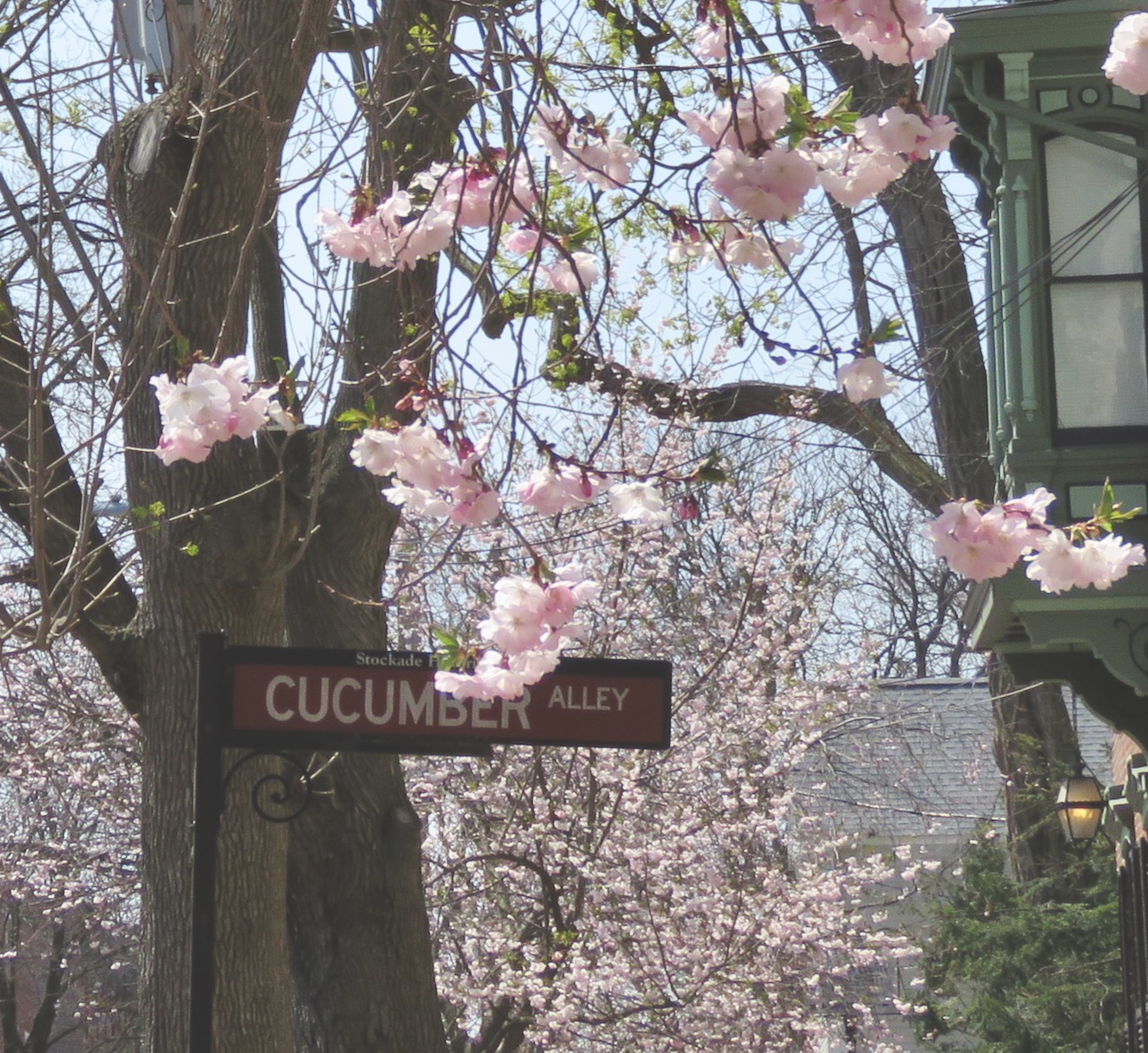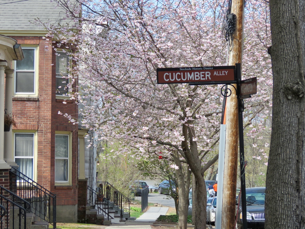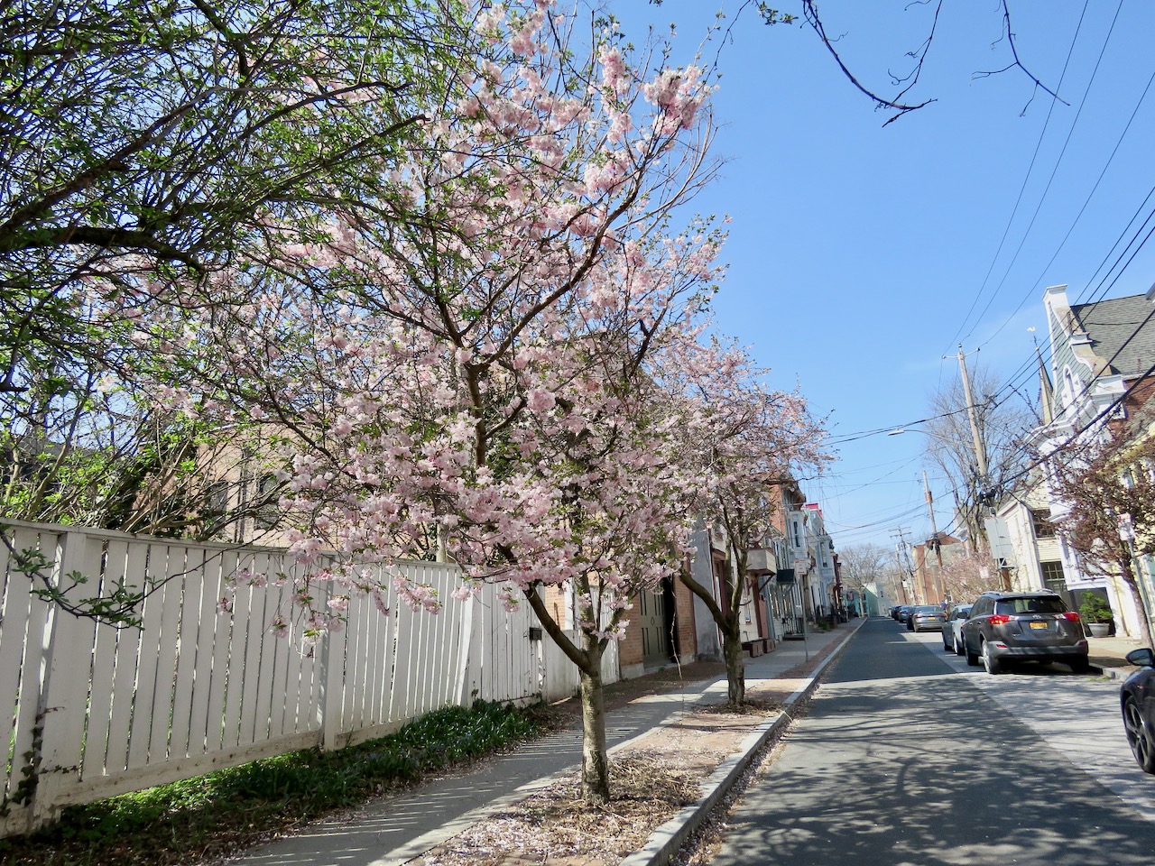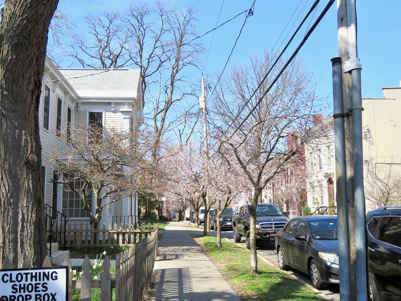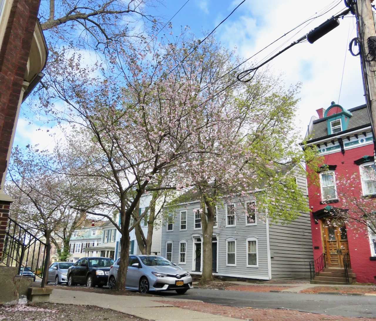 [above] view of cherry trees, north (R) and south (L) from corner of Washington Ave. and Cucumber Alley
