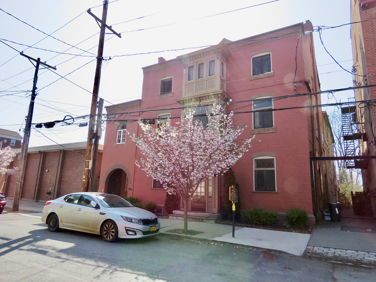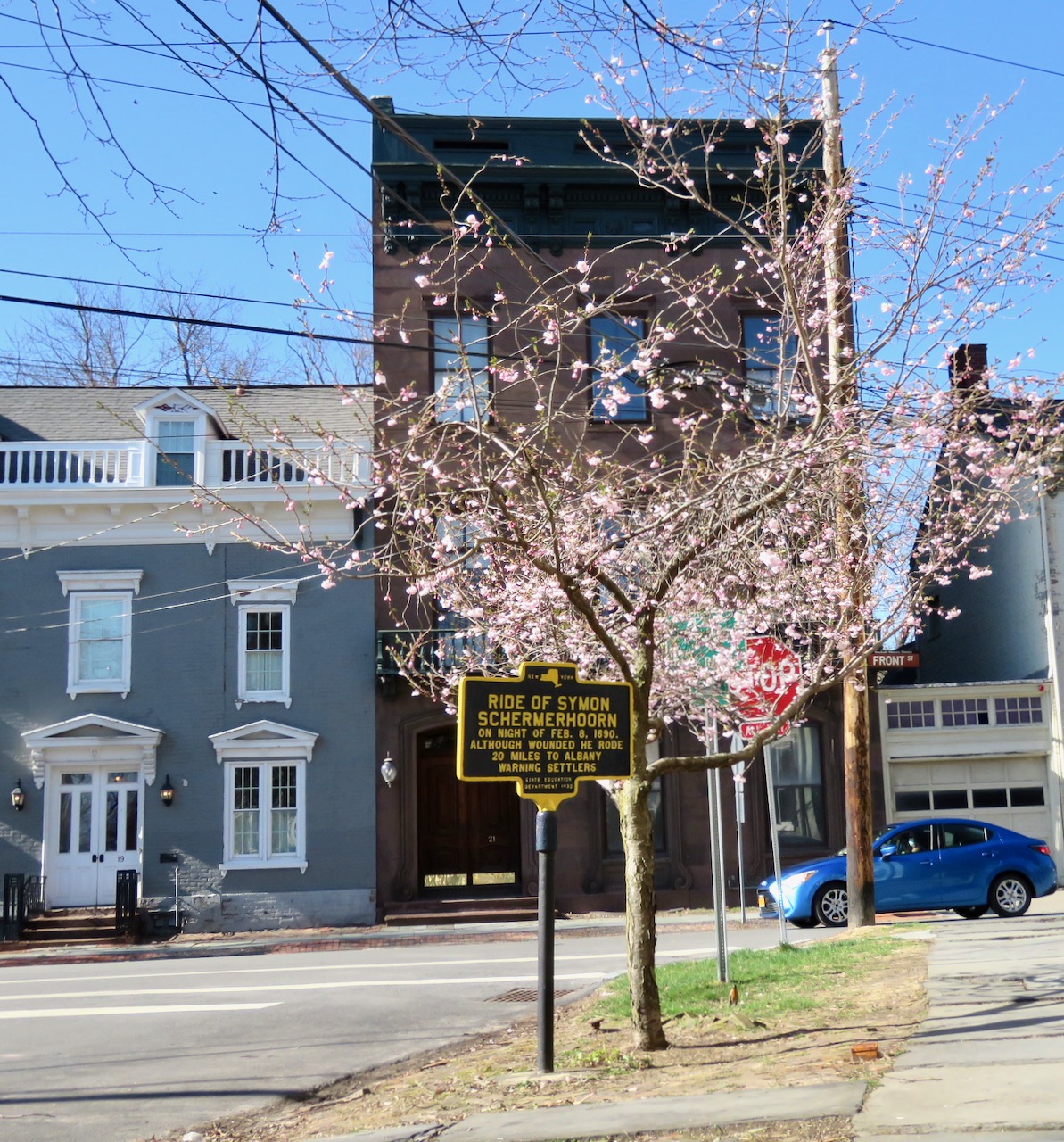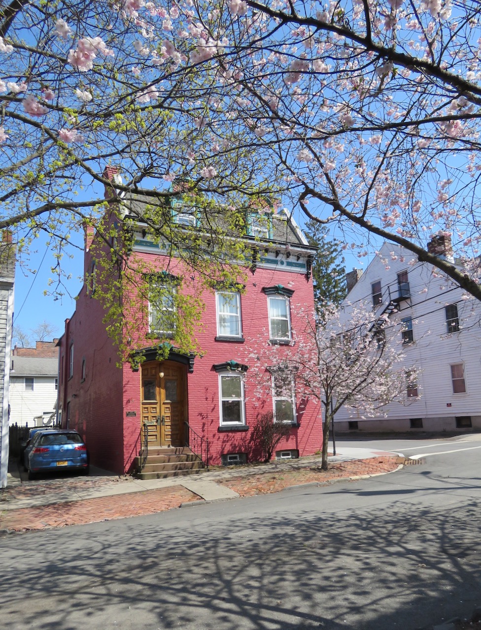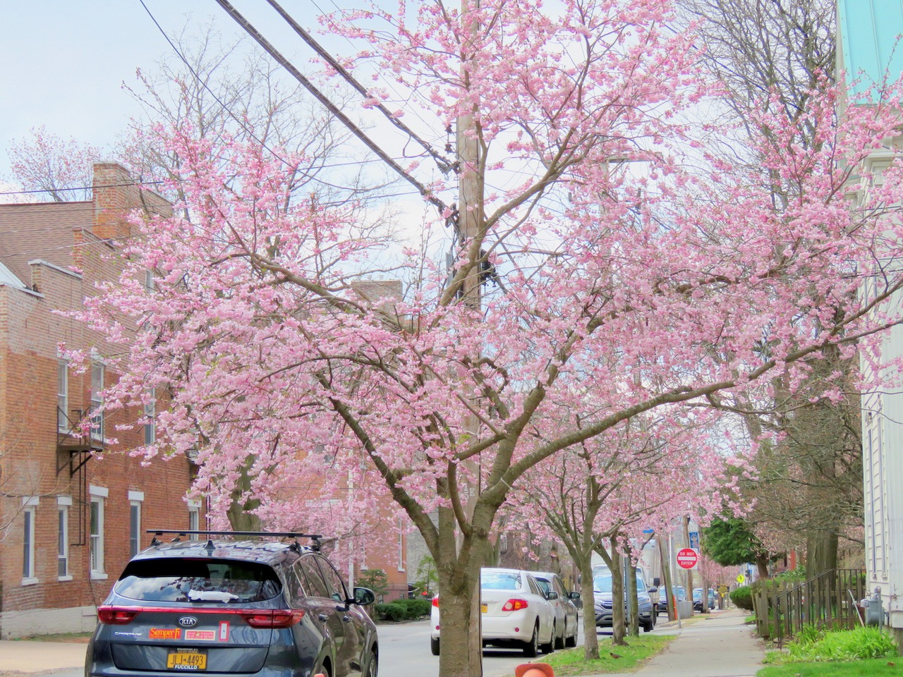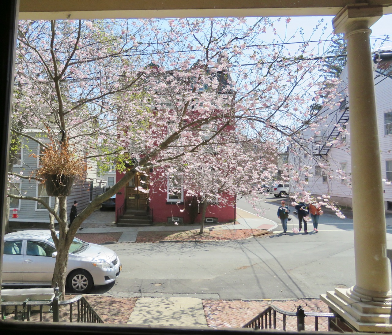 [above] view of cherry trees, north (R) and south (L) from corner of Washington Ave. and Cucumber Alley