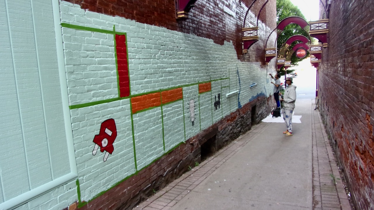 On Friday evening, I was surpised to see an artist painting along the alley-way off Jay St. that leads to the Clinton St. Parking Lot. A colorful, playful Monopoly Board Mural was nearing completion. It was created by the artist Elona Mitchell-Strong, who also hosted a community mural-painting day on the Jay Street pedestrian mall Saturday, June 11. Dowtown Schenectady (DSIC) and the Capital Region Arts Center sponsored Elona’s mural.