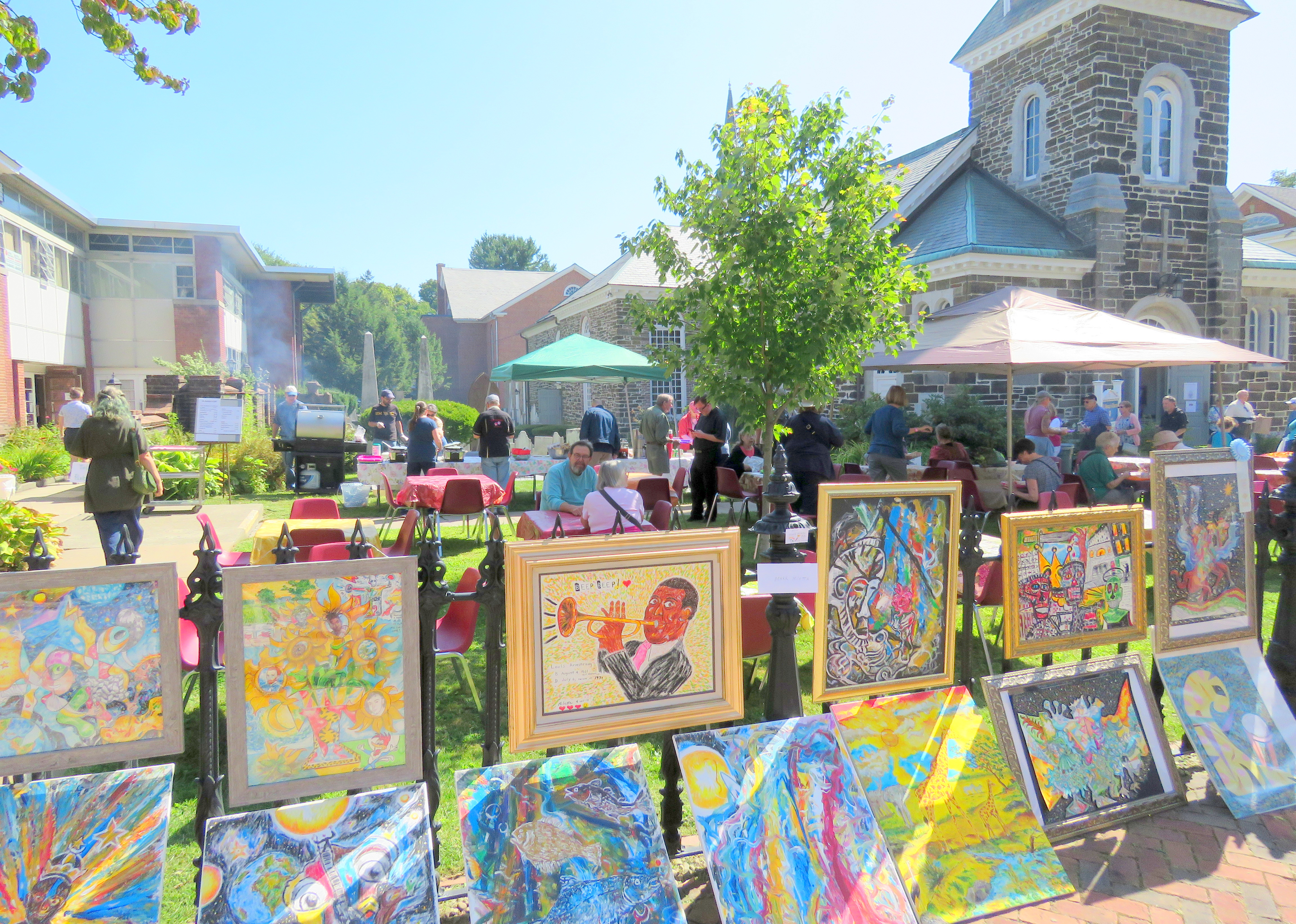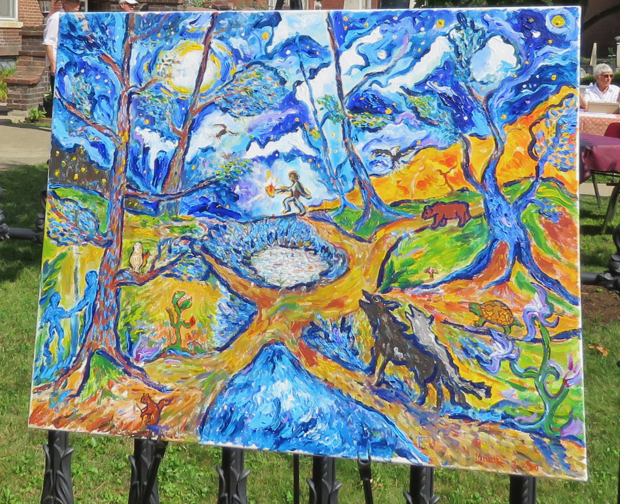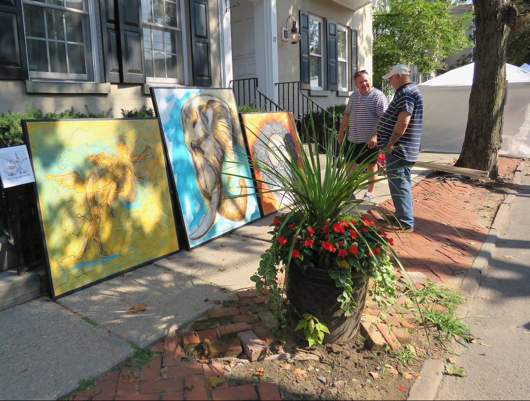 MARK MILETTA has been setting up his painting in a wide display on and along the wrought iron fence in front of St. George’s Episcopal Church for several years. I love getting photos with St. Geo. festivities, cemetery markers, etc., behind Miletta paintings. (see 2019 photo above) So, I left the Sacchetti display expecting to chat for awhile with Mark and to try to decide which pieces to photograph. Instead, I found Mark in a great rush, trying to pick up and secure several of his paintings that had been knocked off easels and the fence by a strong wind-tunnel wind.