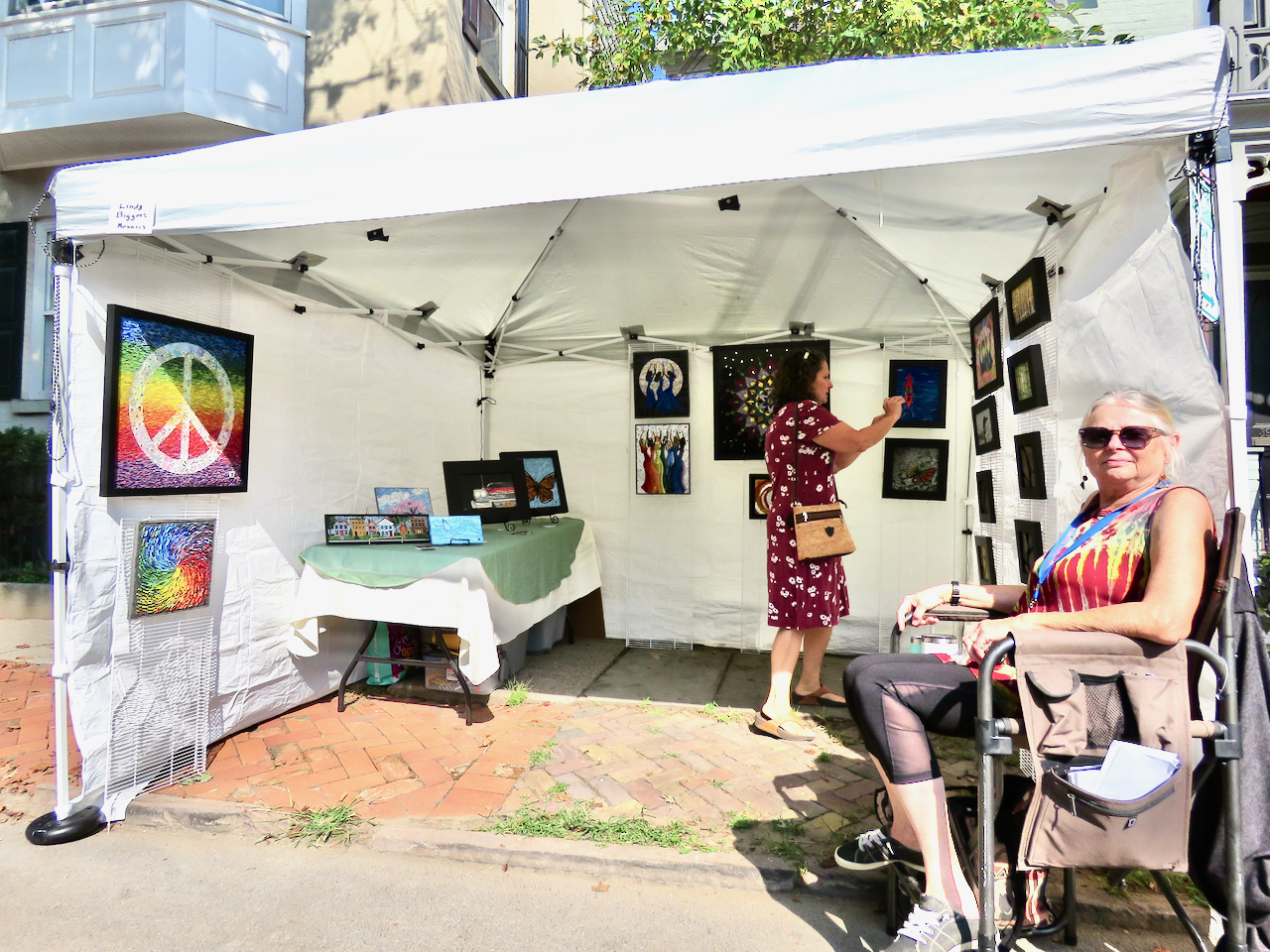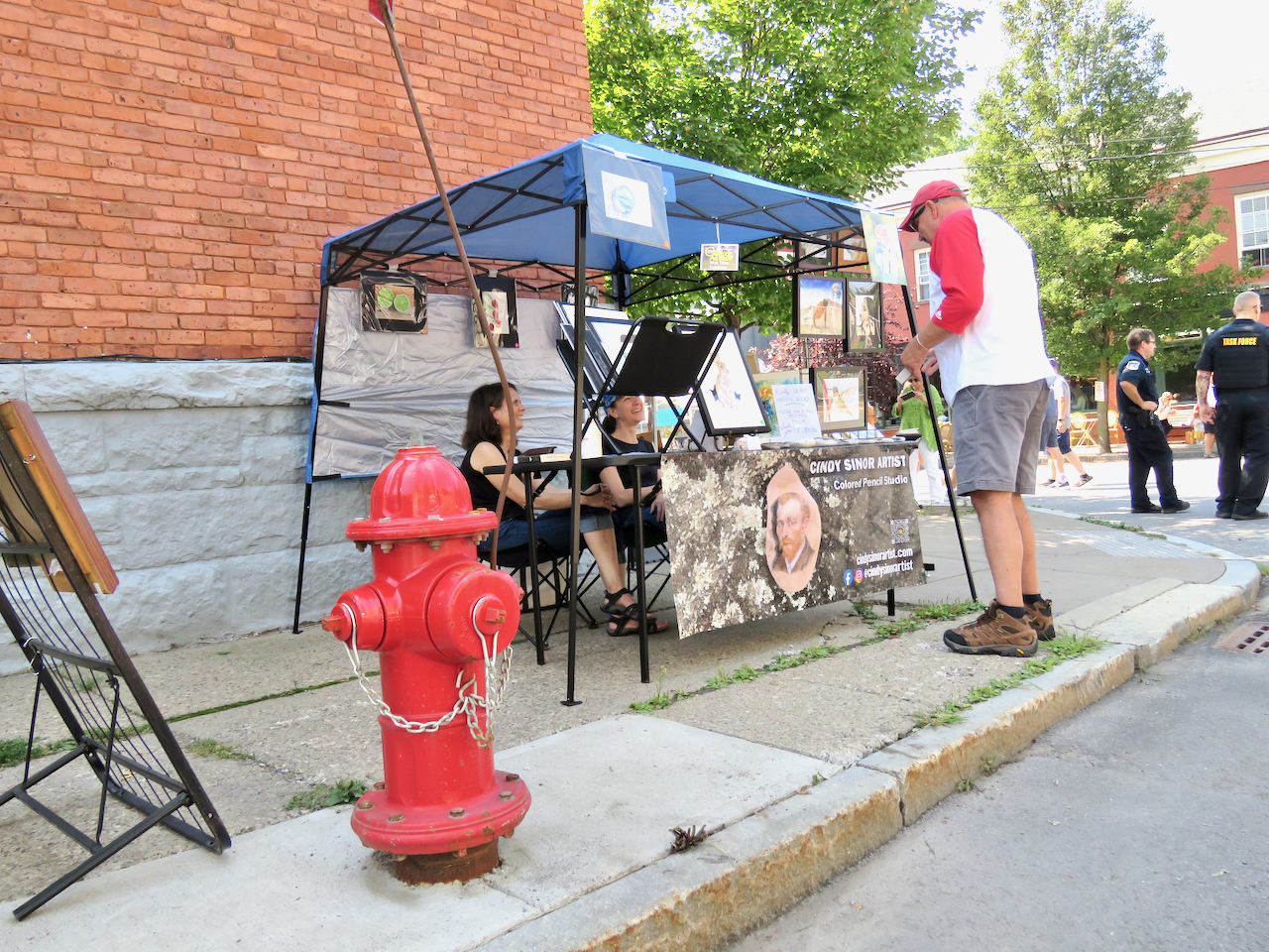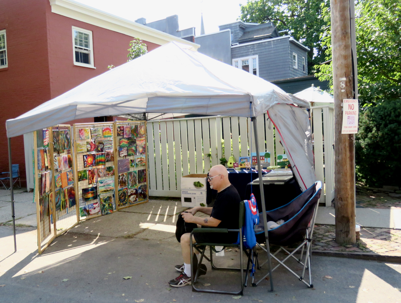 CINDY SINOR, a first-time exhibitor, had her tidy display on the southside corner of Green Street. It was clear that Cindy “likes rocks”, expecially smooth ones that she can paint. Stroll down her Instagram homepage to see her extensive, palm-size, portraiture painted rock collection, and much more.