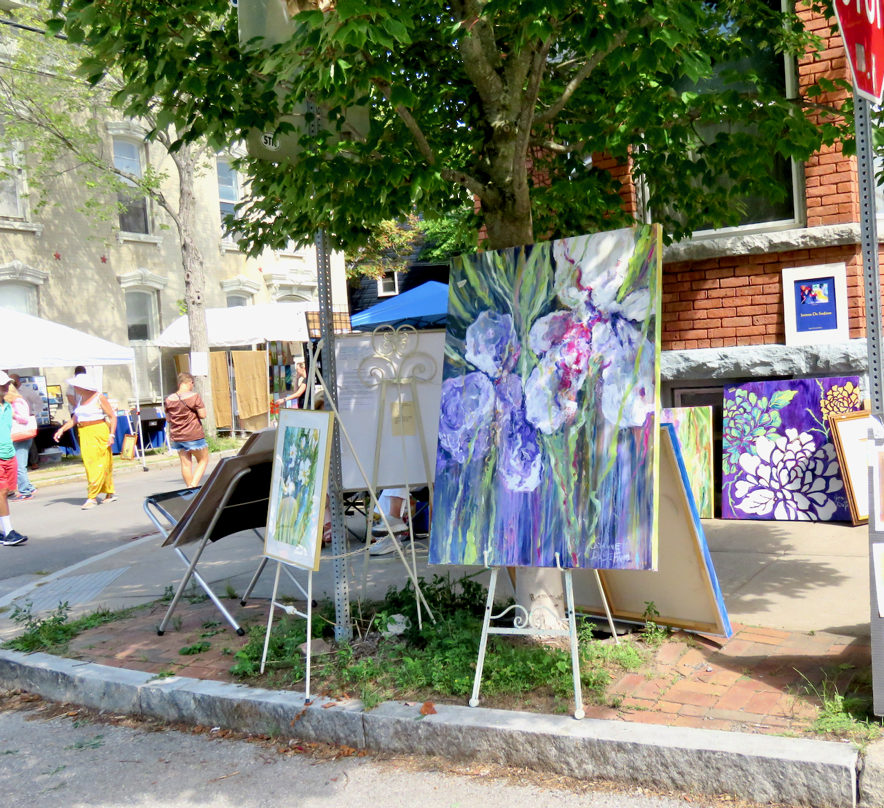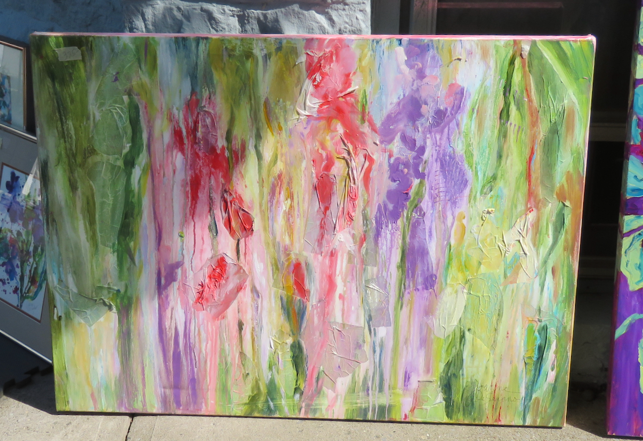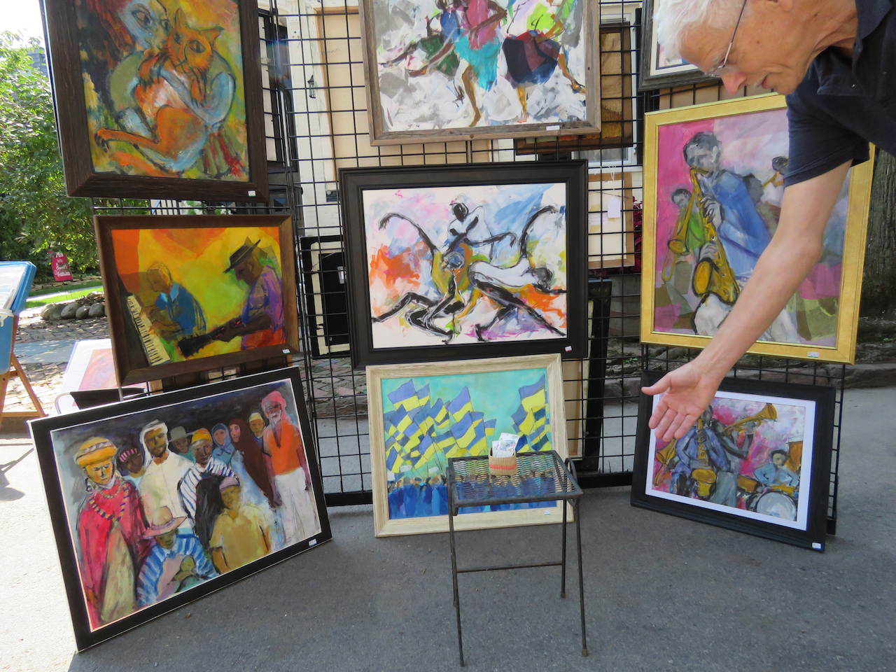 At first, on the sidewalk, I mentioned that Joanne had not brought her large paintings as in prior years. Well, this was the scene when I stepped out into the street: