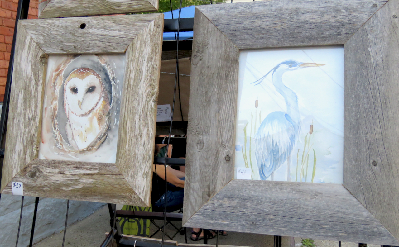 With the occasional exception of Oakley (above left), and the Hodgkins Kids, I try not to use photos of cute puppies or children to drive traffic to my websites. Nonetheless, I am not above using images of koi and blue heron to do so. Thus, I am arbitrarily inserting here, on the right, a Chinese ink painting of koi by Niskayuna resident Anping Liu. And, immediately below, a watercolor image of a great blue heron painted by Scotia’s Christine Mezzo, who was 70 on Art Show day, and rightly proud of it. Ms. Mezzo makes those wooden frames, too.