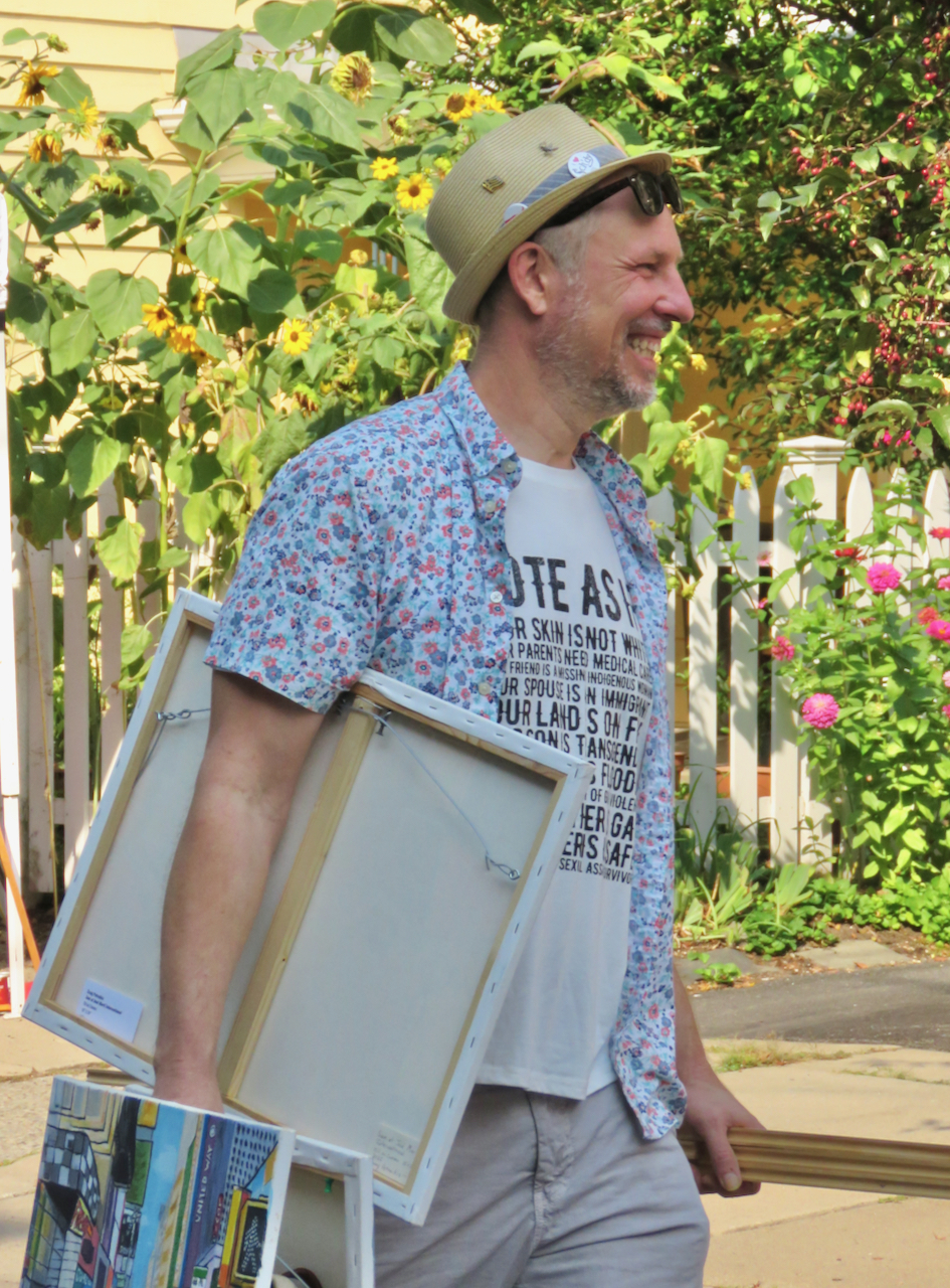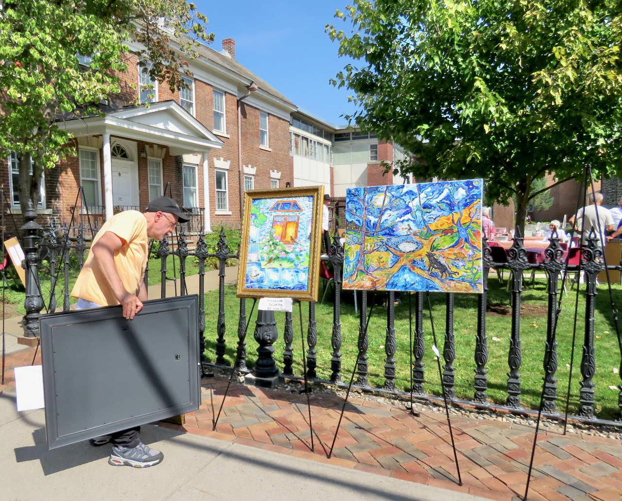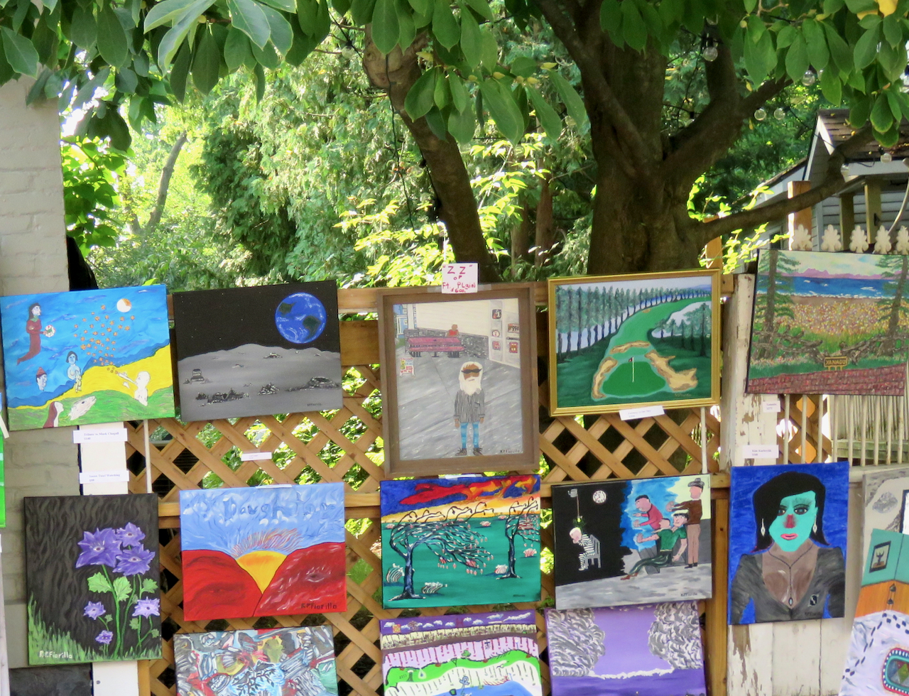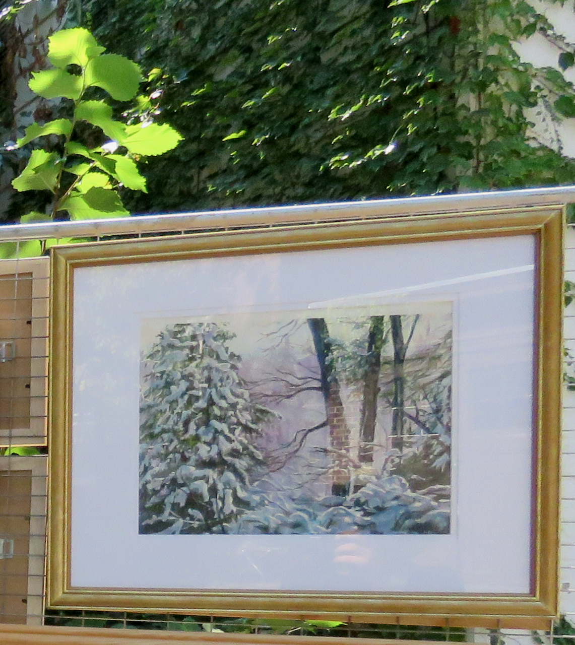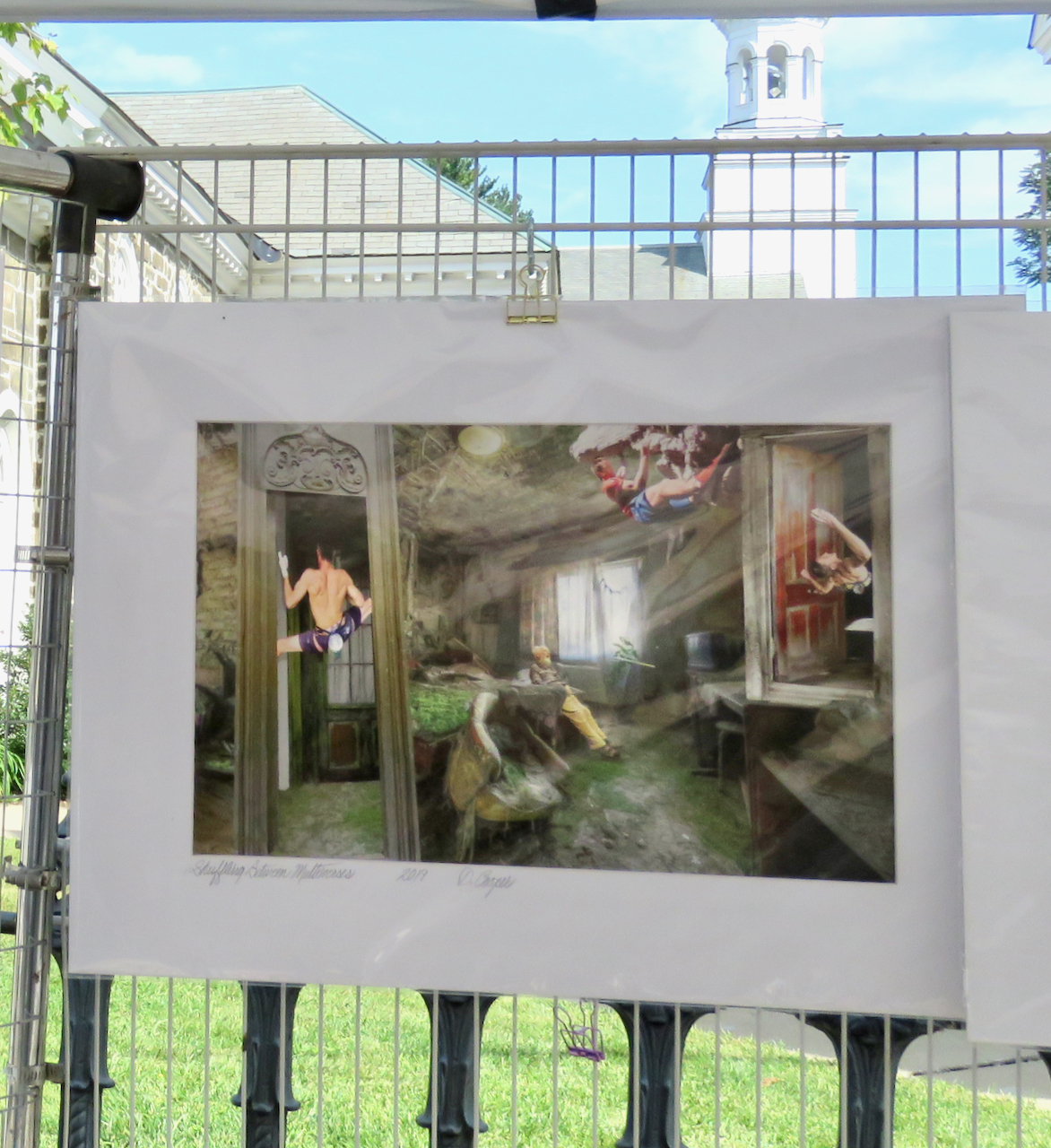 My art show stroll always starts on Front Street at North Church St. On the right (south side) there is a long wall bordering the yard of 22 N. Church Street. Most of that stretch has been occupied by Stockade neighbor Bob Laper for many years, but Bob decided to be an art browser rather than exhibitor this year. Also, half of the wall had to be torn down and is in the process of reconstruction.