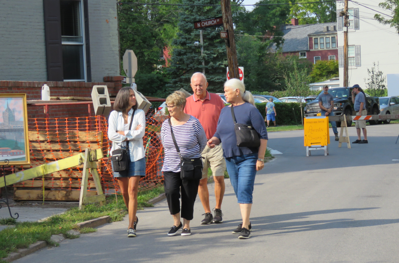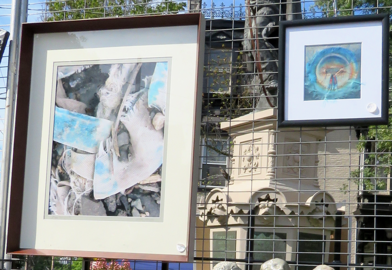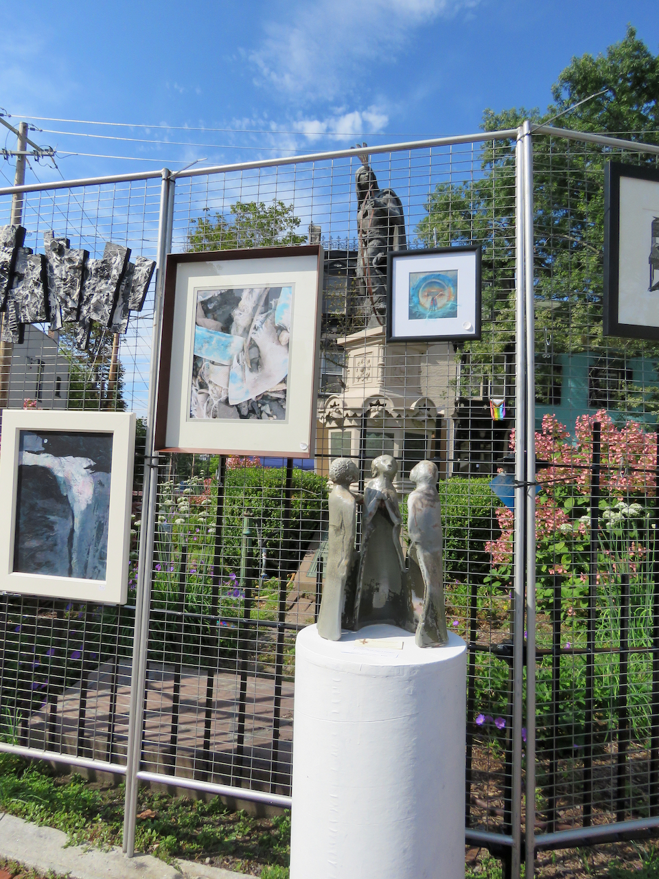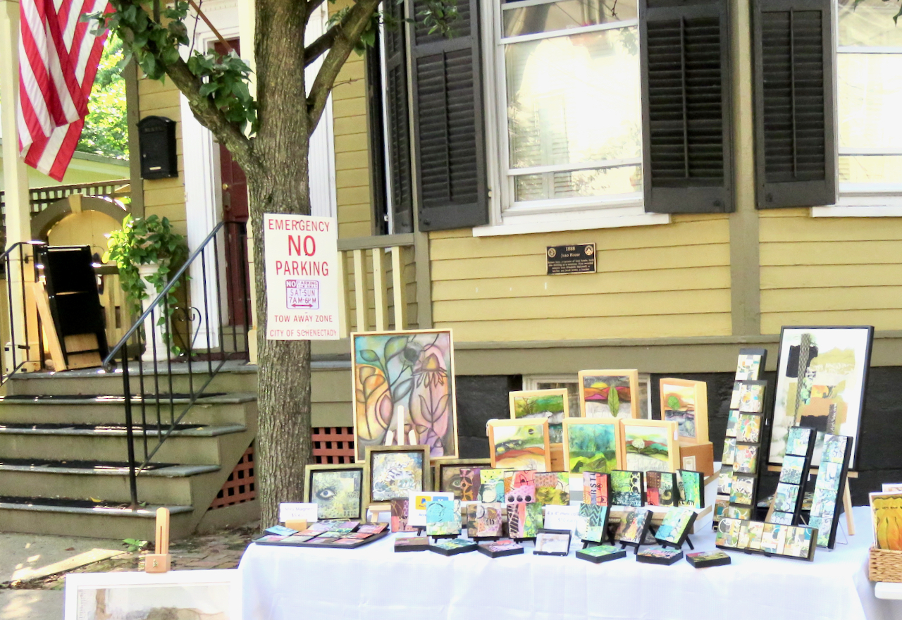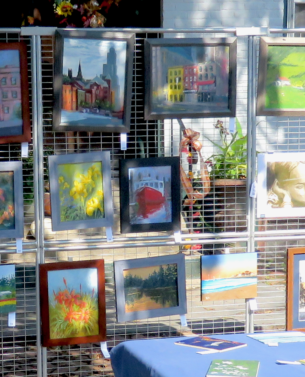My art show stroll always starts on Front Street at North Church St. On the right (south side) there is a long wall bordering the yard of 22 N. Church Street. Most of that stretch has been occupied by Stockade neighbor Bob Laper for many years, but Bob decided to be an art browser rather than exhibitor this year. Also, half of the wall had to be torn down and is in the process of reconstruction.