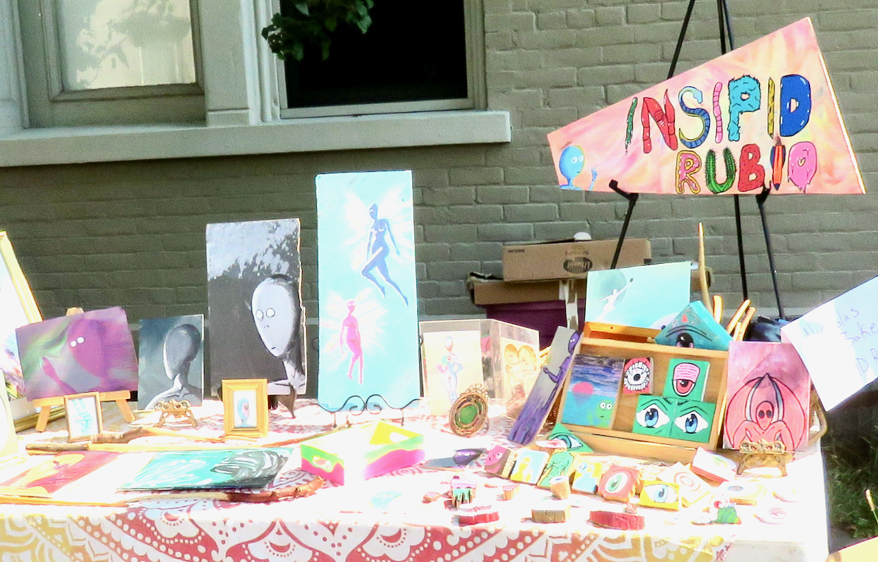 Next to the Biggers tent, another mother was helping her daughter set up her first Stockade exhibit. NIKKI JONES, who does her artistic business under the name ICKIBONES, had many representations of her sculpture art and illustration skills.