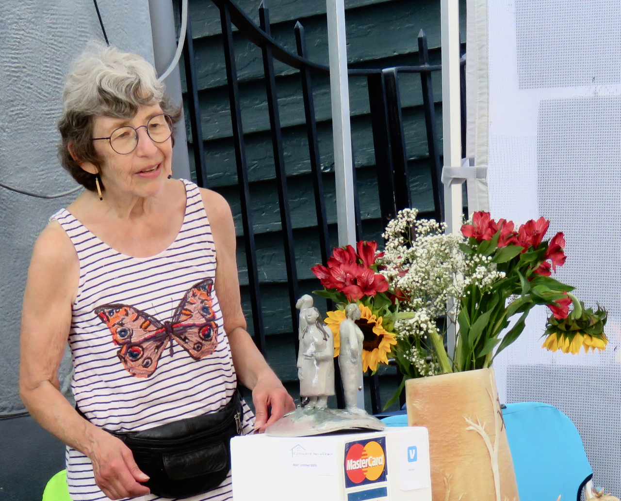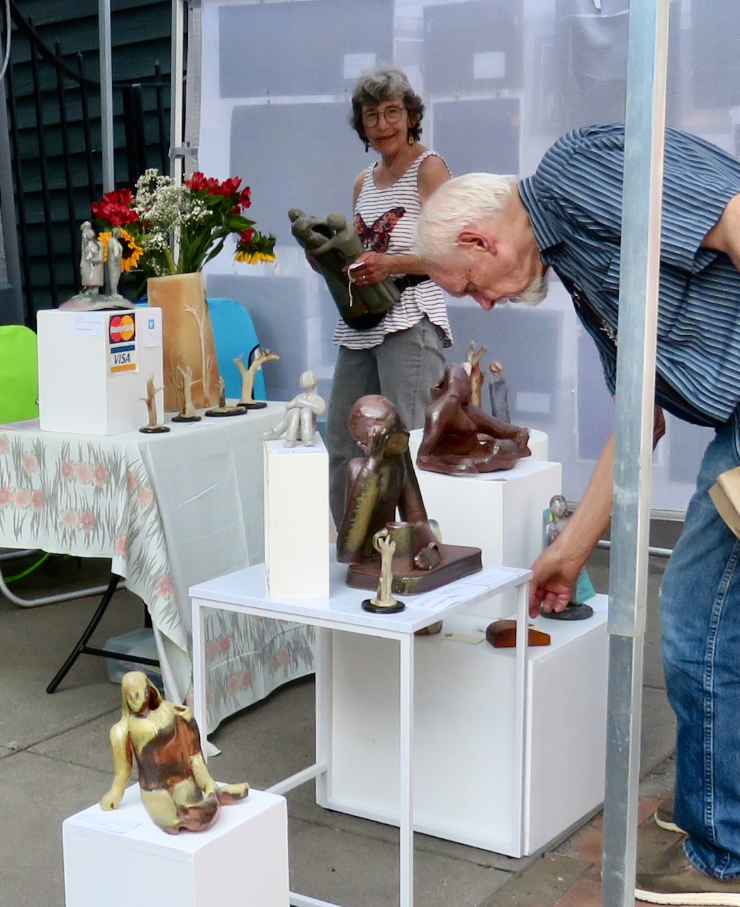 It was good to see Nancy Niefield. Her pottery shop was once on the Jay Street Pedestrian Mall. Nancy’s three-figure sculpture (at the left) won Best Depiction of the Human Form this year. Here she is at her 2022 Exhibit:
