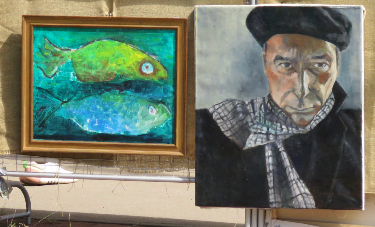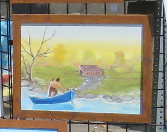 When I got to his grand display on Saturday, I snapped the photo at the top of this section, and was drawn to voices behind the façade of the exhibit. It seems rabid fans of his wanted Rick’s picture with the pudgy orange fish. The artist was so shy, however, he held the painting in front of his face, and I captured the moment. [photo to the left]