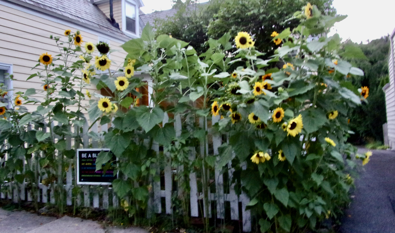 A couple blocks away, Gloria Kishton and Bob Lemmerman grace us with a grand array of sunflowers at 207 Union St. Thanks, G & B!