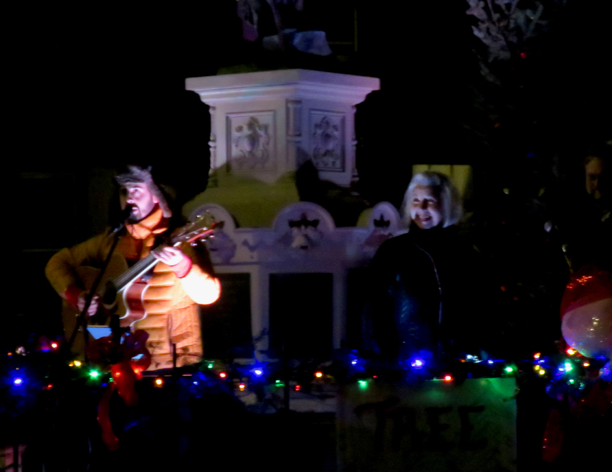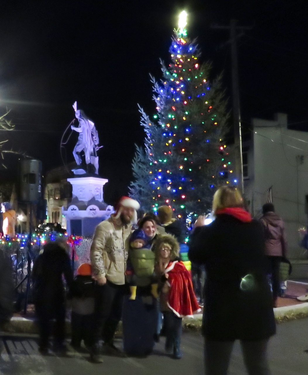 . . songster Justin Friello, MC Colleen Macaulay, and Santa join Lawrence and the newly-lighted Stockade Tree