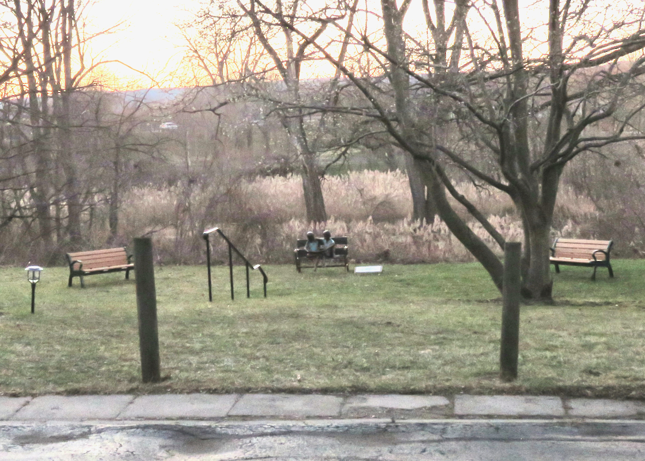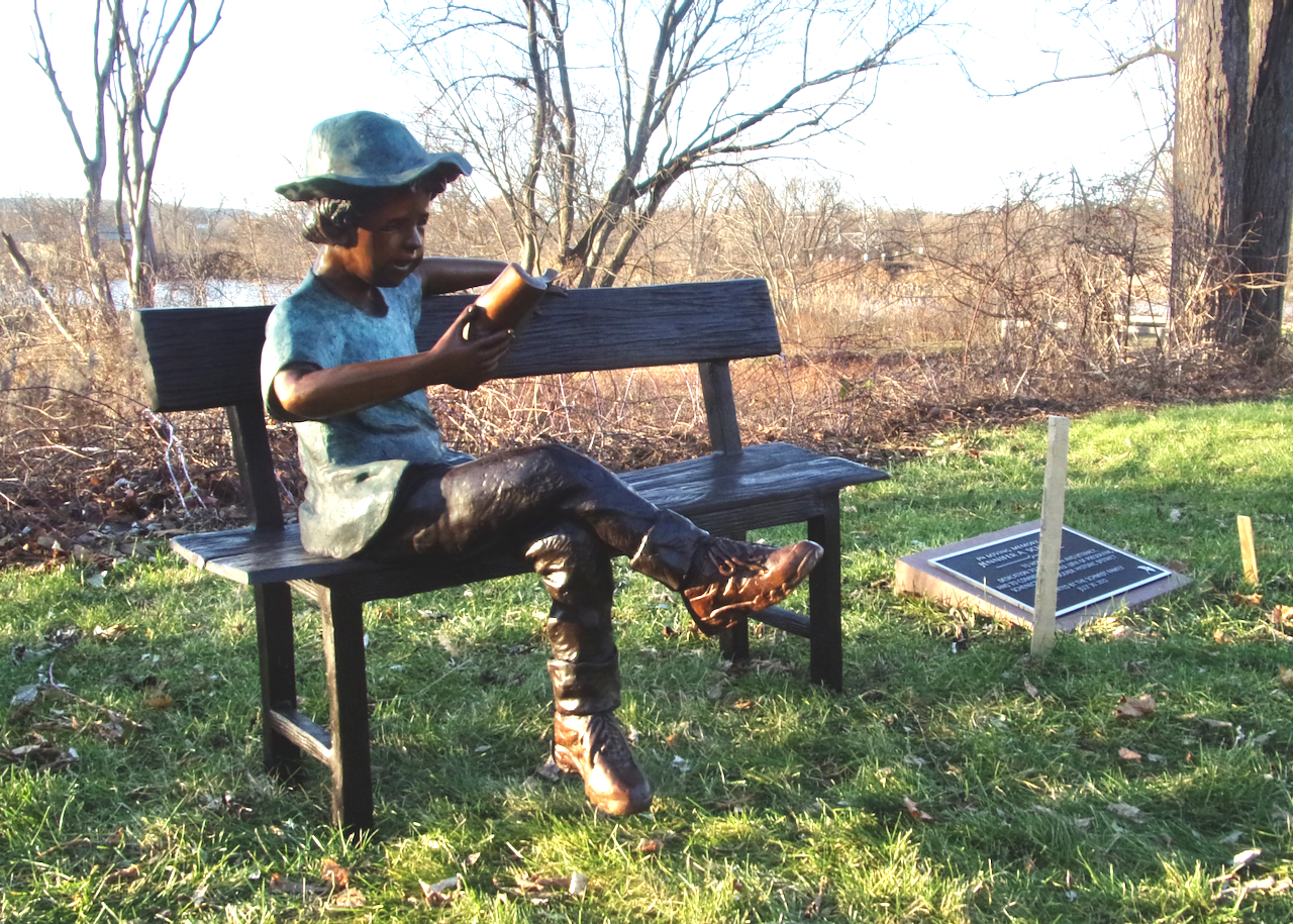 They are situated on the terraced lawn behind 32 Washington Avenue, the home of the Schenectady County Historical Society, in the Schenectady Stockade. It has long been one of my favorite spots to view and photograph in the soft light before sunset. With waterside reeds (phragmites) in the background, along the Binnekill (Creek), the young readers beckon neighbors and visitors to stop by.