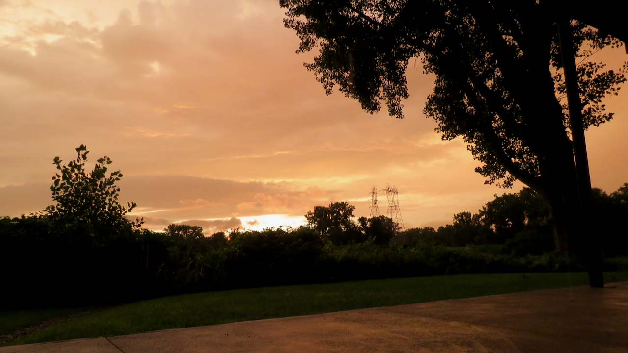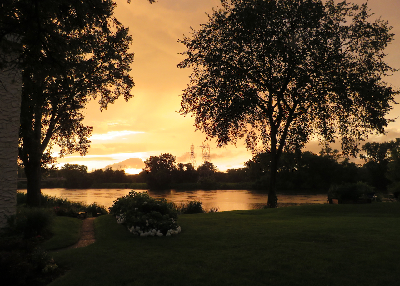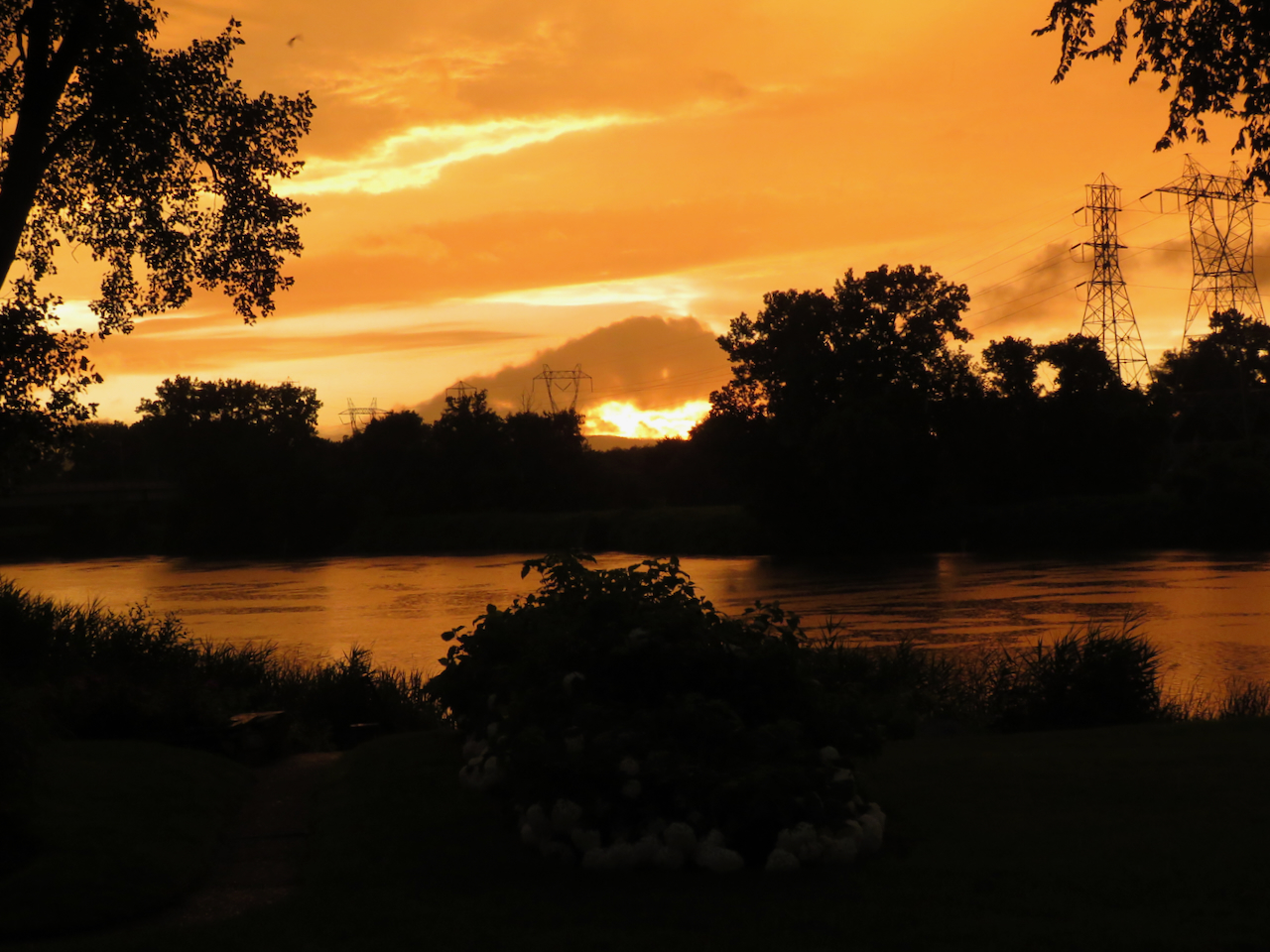 The “warmest July ever” brought many rowdy thunderstorms to New York’s Capital District this month. But, as often happens after our thunder-boomers, the aftermath graced us with some very special sunsets. This posting commemorates the golden* sunset of July 13, 2023, as seen from the north end of Cucumber Alley, in the Schenectady Stockade historic district. The view from the Mohawk River-bank is looking toward the Isle of the Cayugas and the village of Scotia NY.