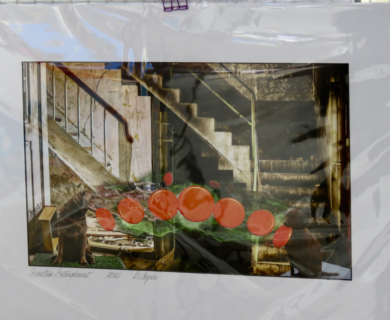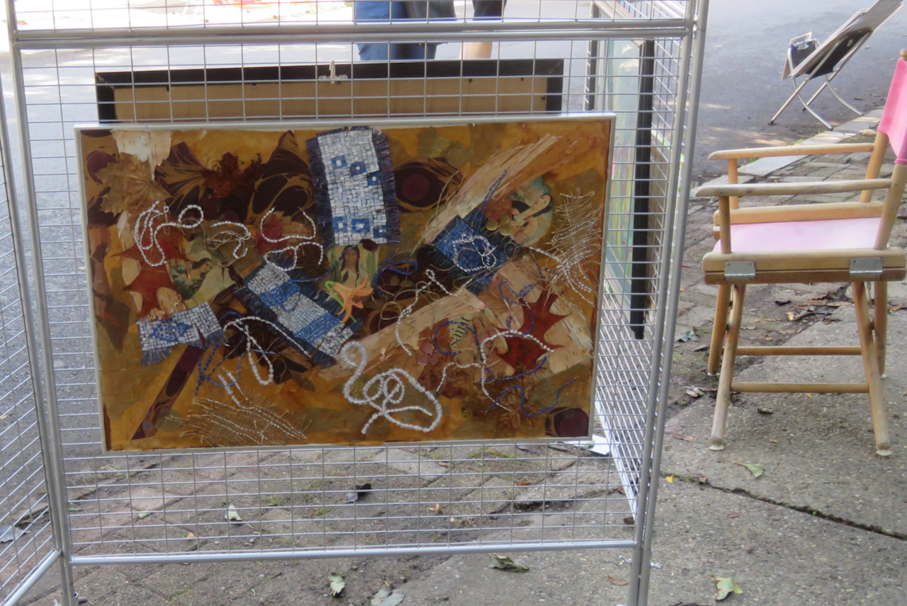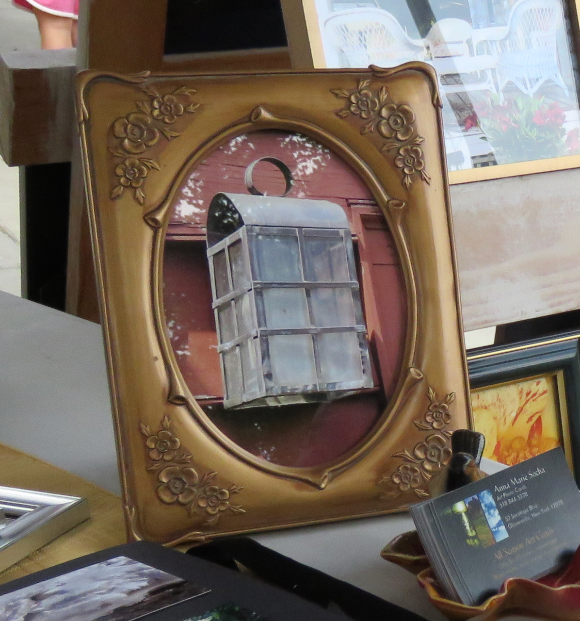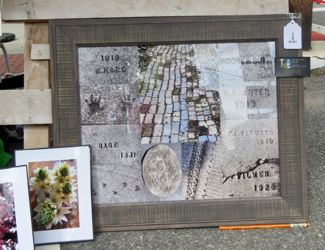 ANNA MARIE SOCHA was a gracious and informative host, and showed me a photo-collage of ancient sidewalks. Last year I focused on her red-flower triptych, but this year a Lantern and the sidewalk collage got my focus.