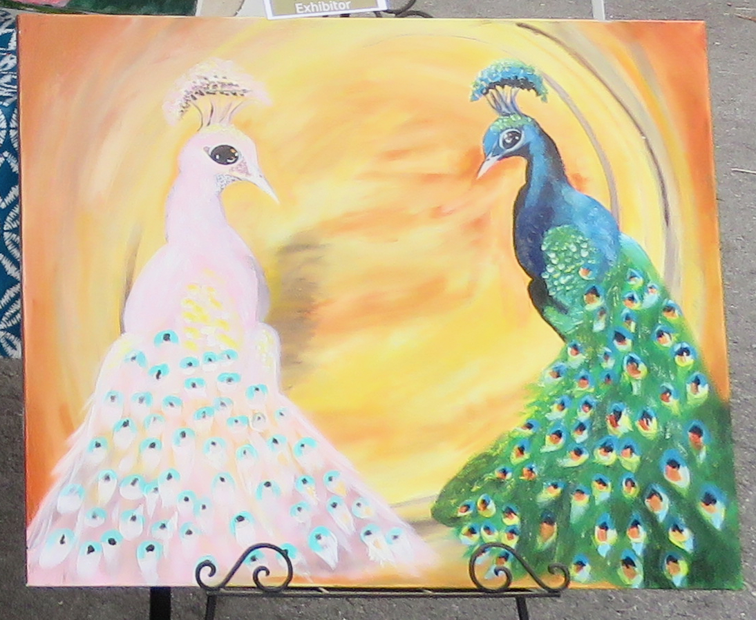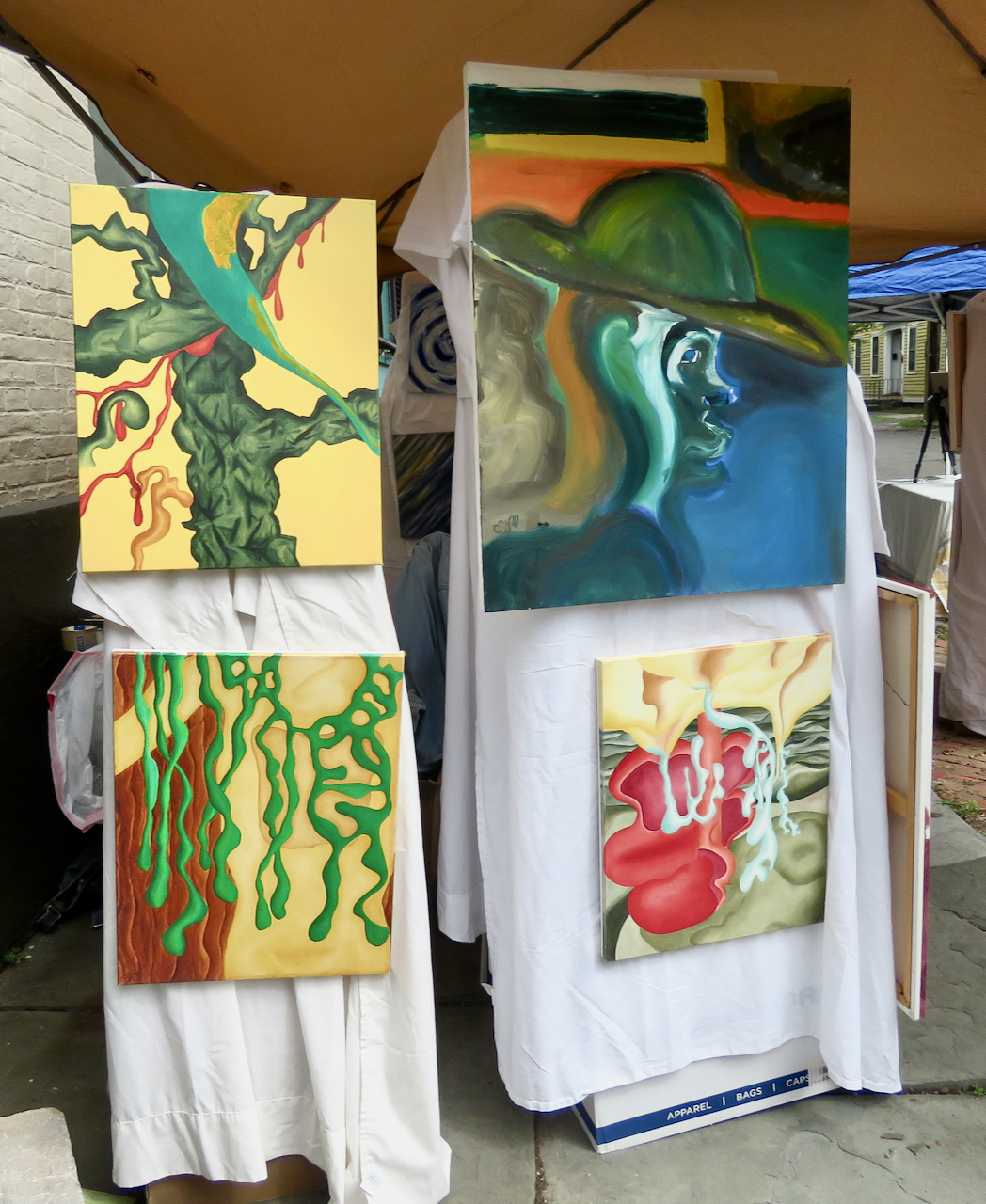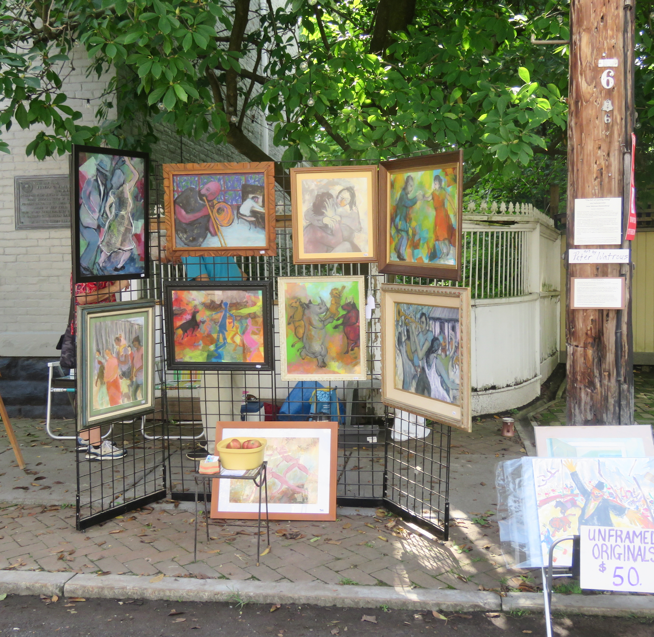 Turning onto Green Street, there was a happy sight: two of my favorite returning artist exhibits: the tent of Anping Liu and Xiaoping “Sherrie” Xu, and Val Robert’s vibrant spread. [to be continued]