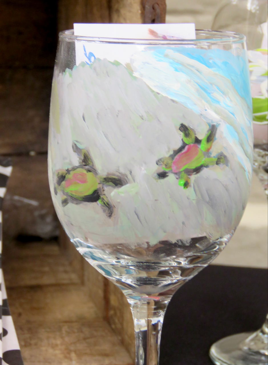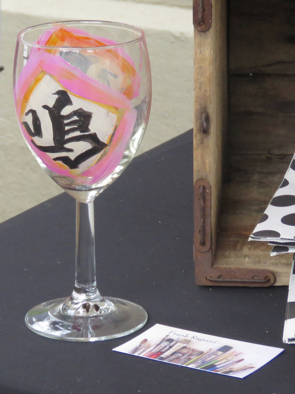After admiring Frank’s painted wine glasses (a classy one to the left, and yet another with a turtles theme), I realized I was behind on my “schmoozin’ and shootin'” schedule for the Art Show and award ceremony, and reluctantly pushed on without getting more images of Frank’s work. I’m hoping Frank will forgive me and show me more of his art some day soon, maybe with painted wineglasses on their porch or my stoop.