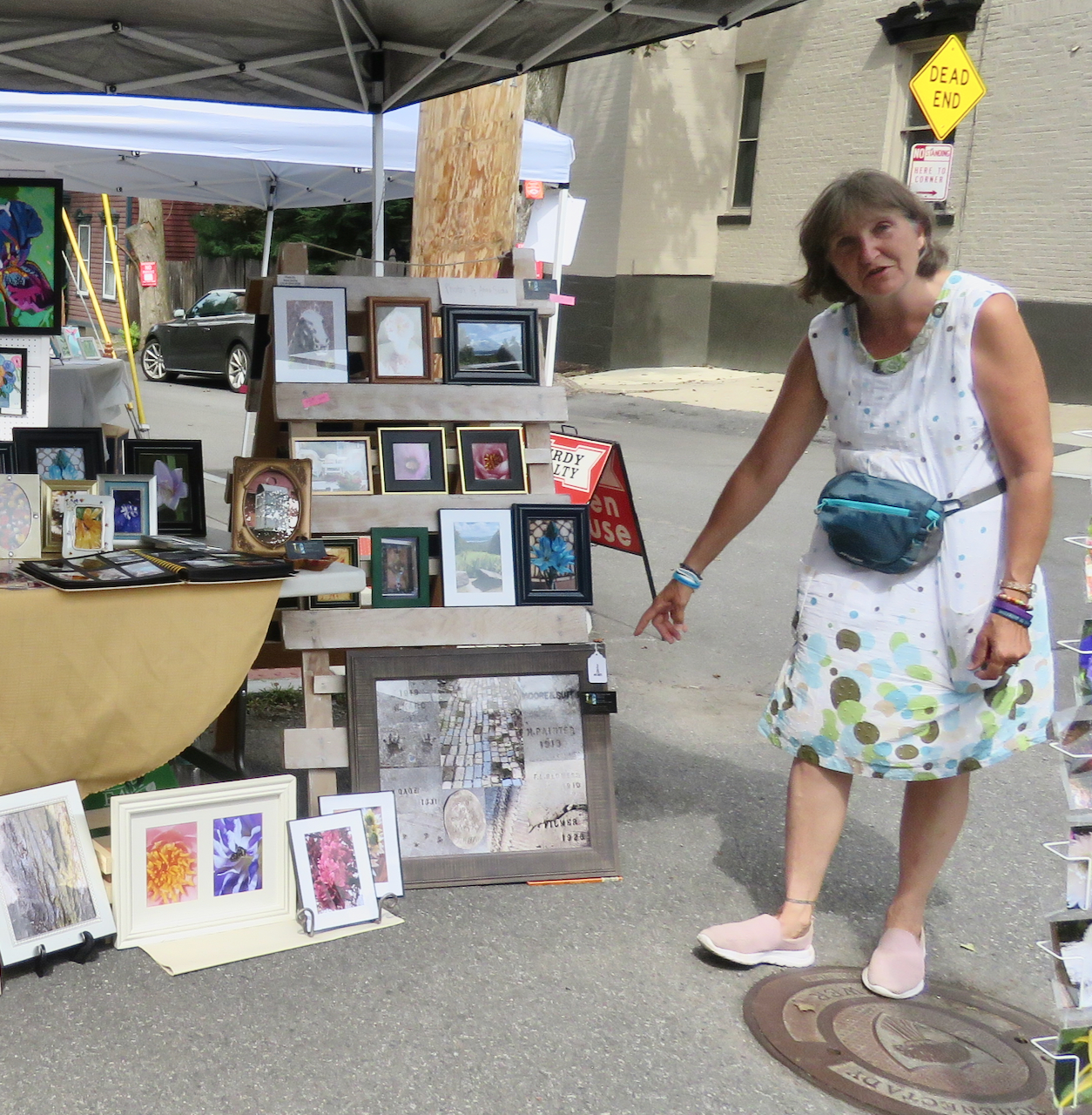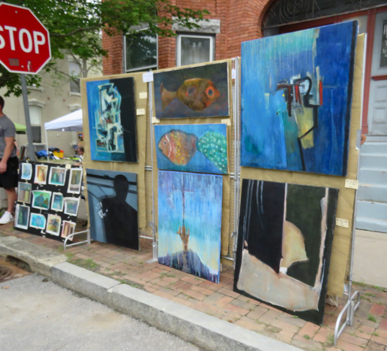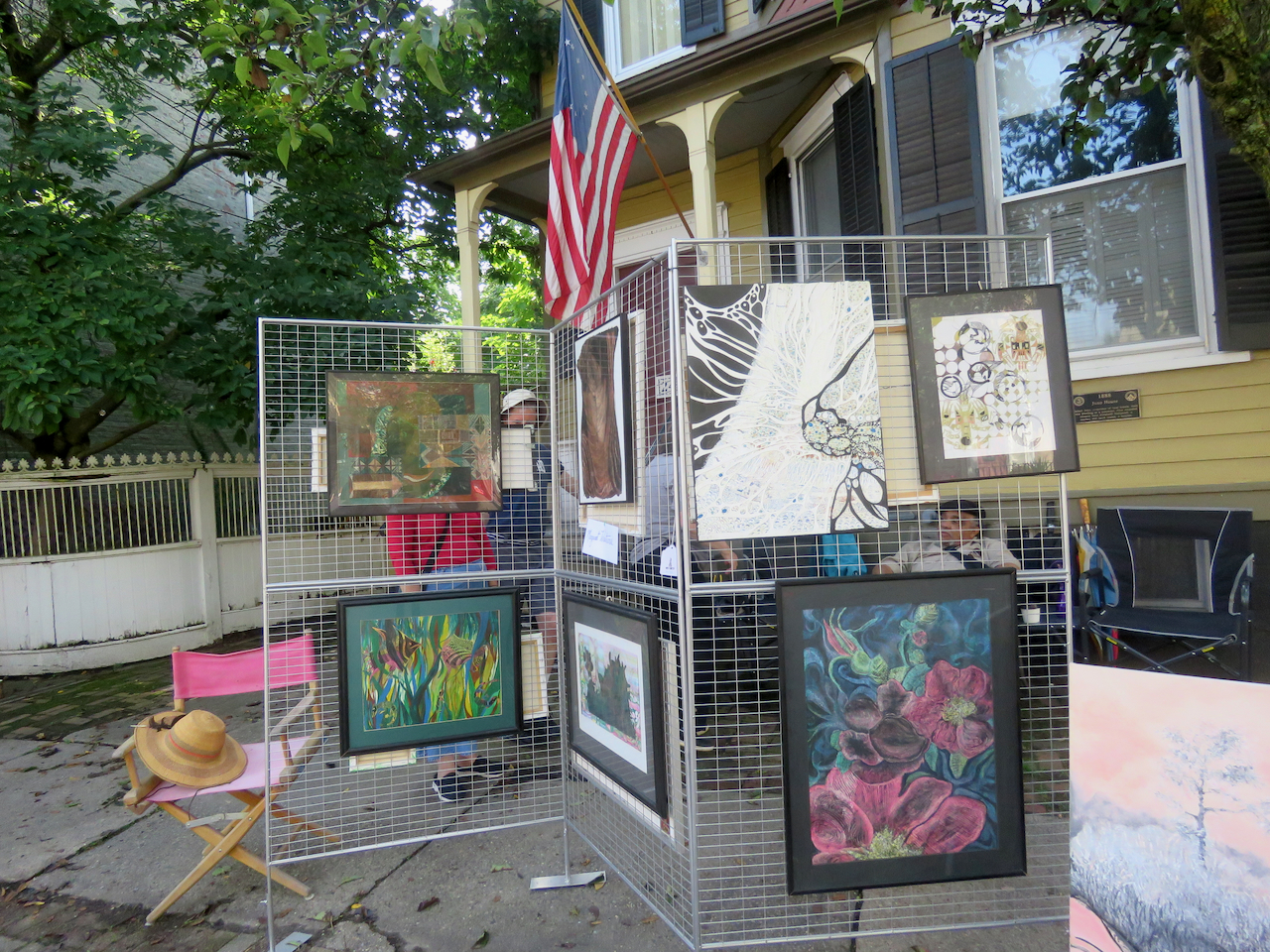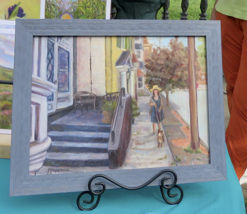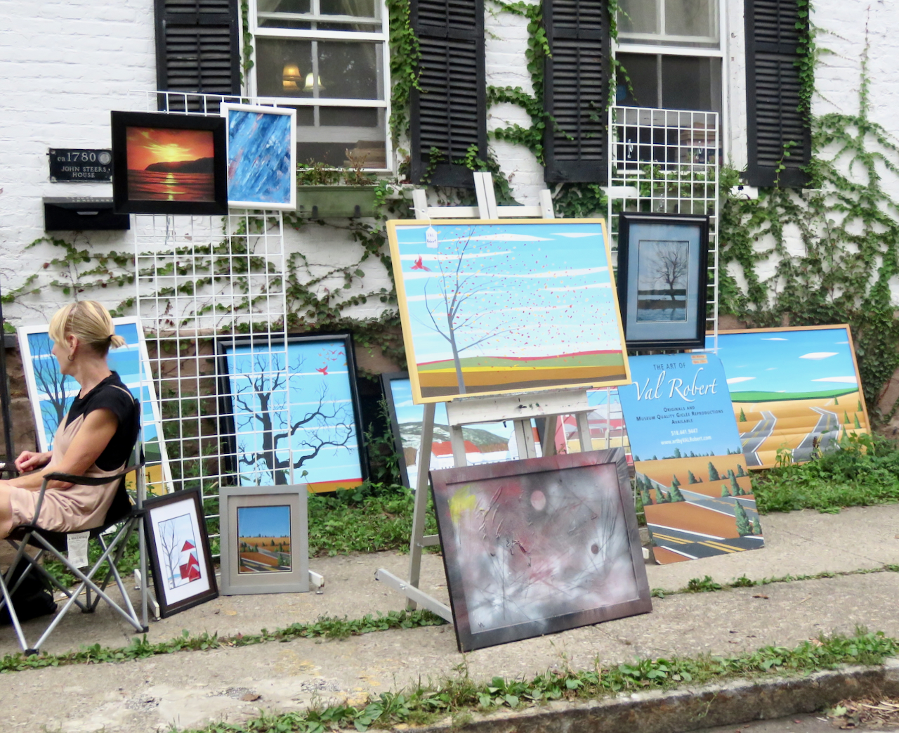 I’m glad I looked over toward Arthurs’ 1795 Market as I was leaving Green Street. I saw a display I had been missing: Pina Calabro’s warm-hearted face and exhibit. [This is the 3rd corner of Front and N. Ferry Streets that Pina has used at the Outdoor Art Show (2022; 2021). I hope she’ll claim it again next year, for its ambiance and centrality.]