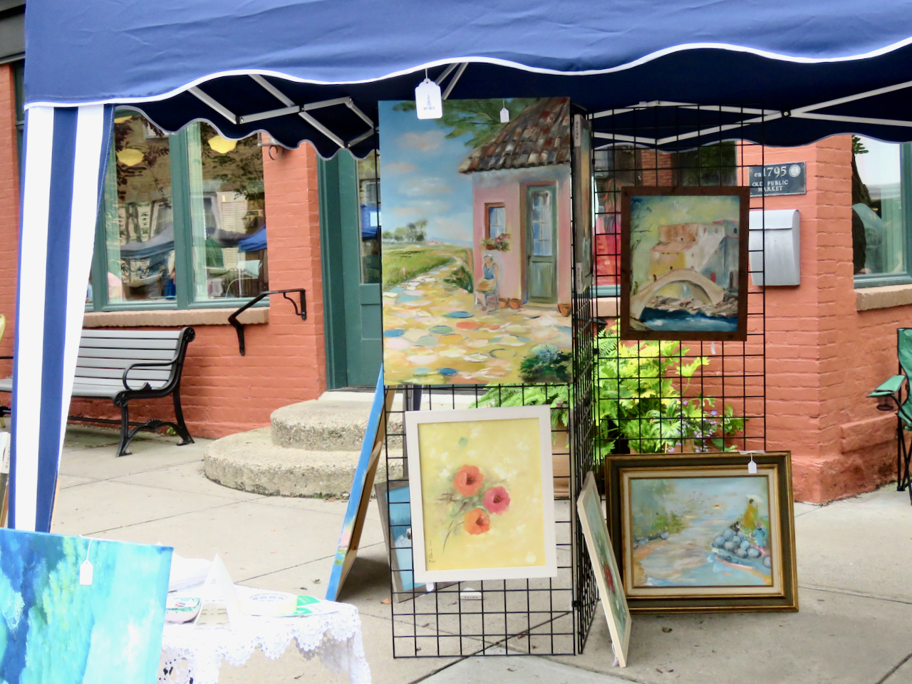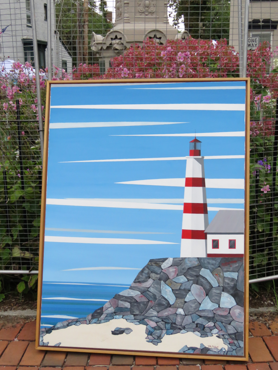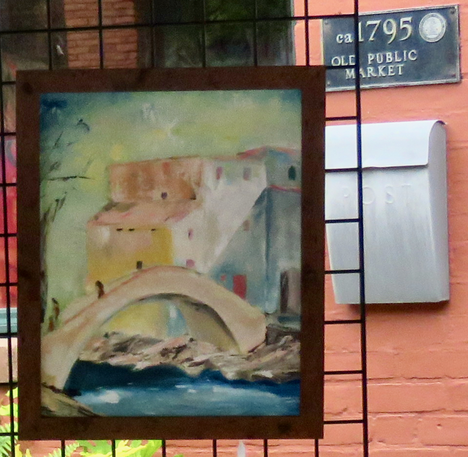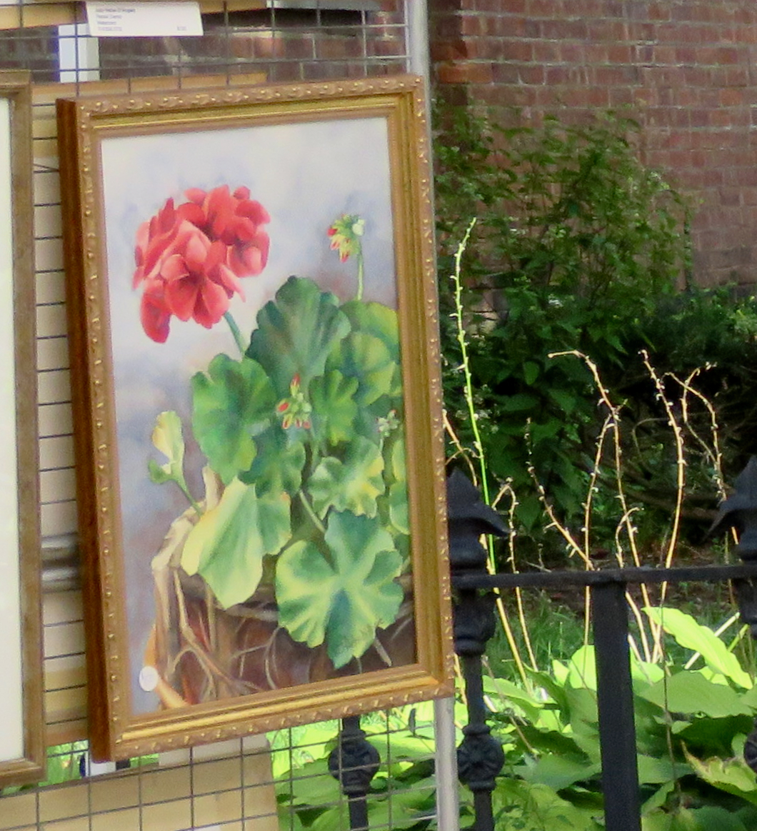 I’m glad I looked over toward Arthurs’ 1795 Market as I was leaving Green Street. I saw a display I had been missing: Pina Calabro’s warm-hearted face and exhibit. [This is the 3rd corner of Front and N. Ferry Streets that Pina has used at the Outdoor Art Show (2022; 2021). I hope she’ll claim it again next year, for its ambiance and centrality.]