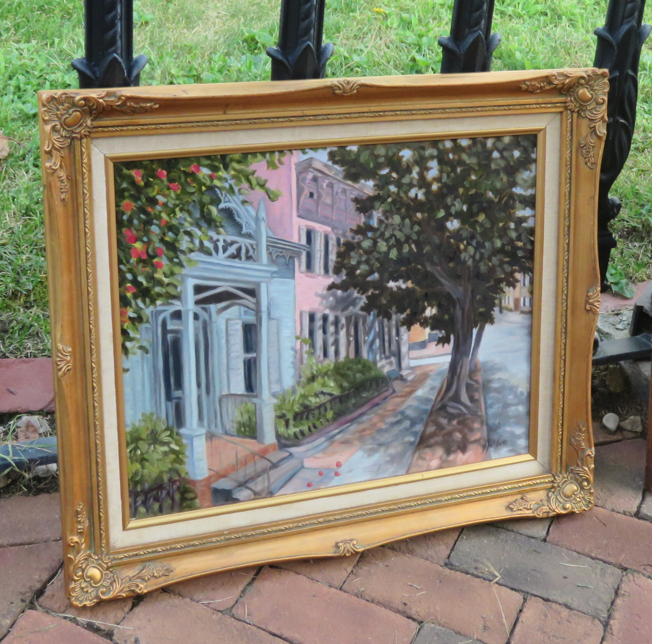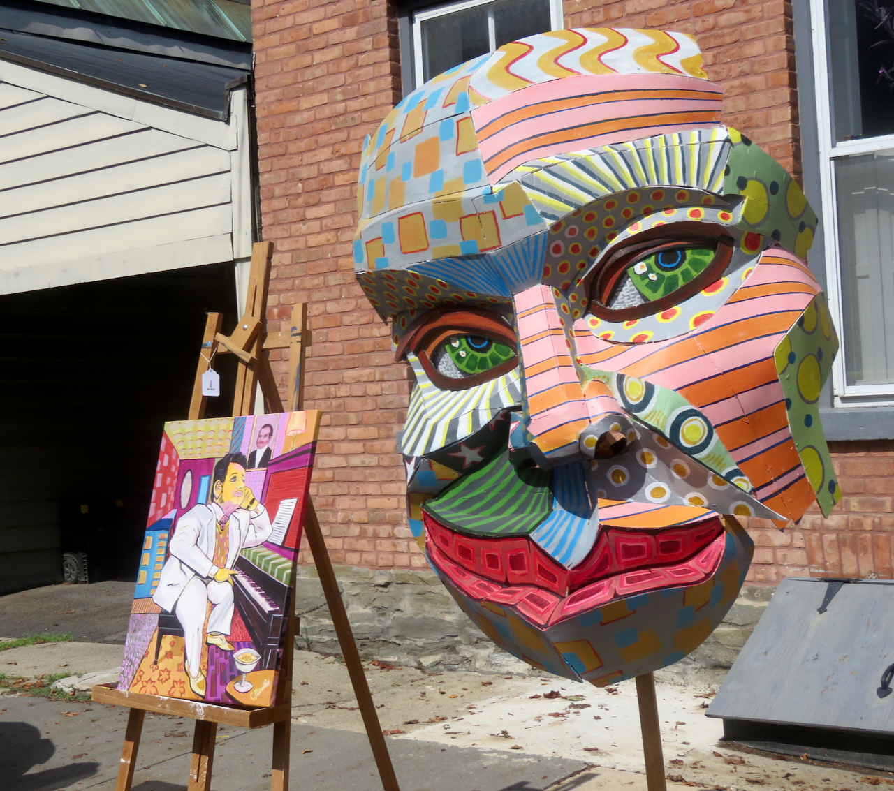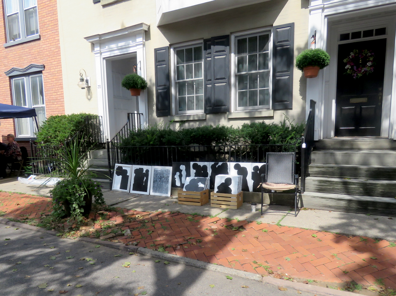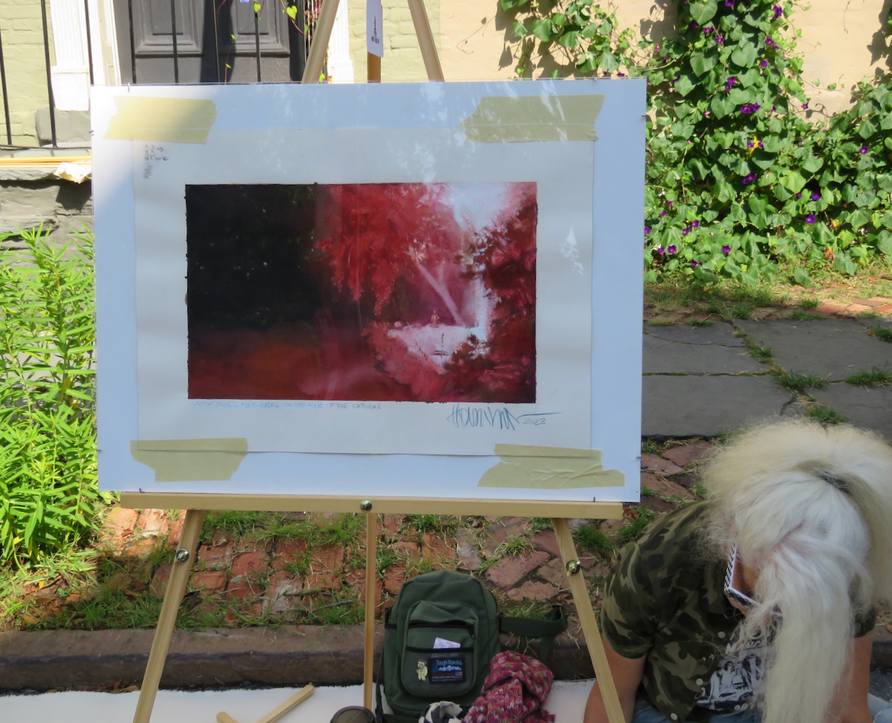 I’m glad I looked over toward Arthurs’ 1795 Market as I was leaving Green Street. I saw a display I had been missing: Pina Calabro’s warm-hearted face and exhibit. [This is the 3rd corner of Front and N. Ferry Streets that Pina has used at the Outdoor Art Show (2022; 2021). I hope she’ll claim it again next year, for its ambiance and centrality.]