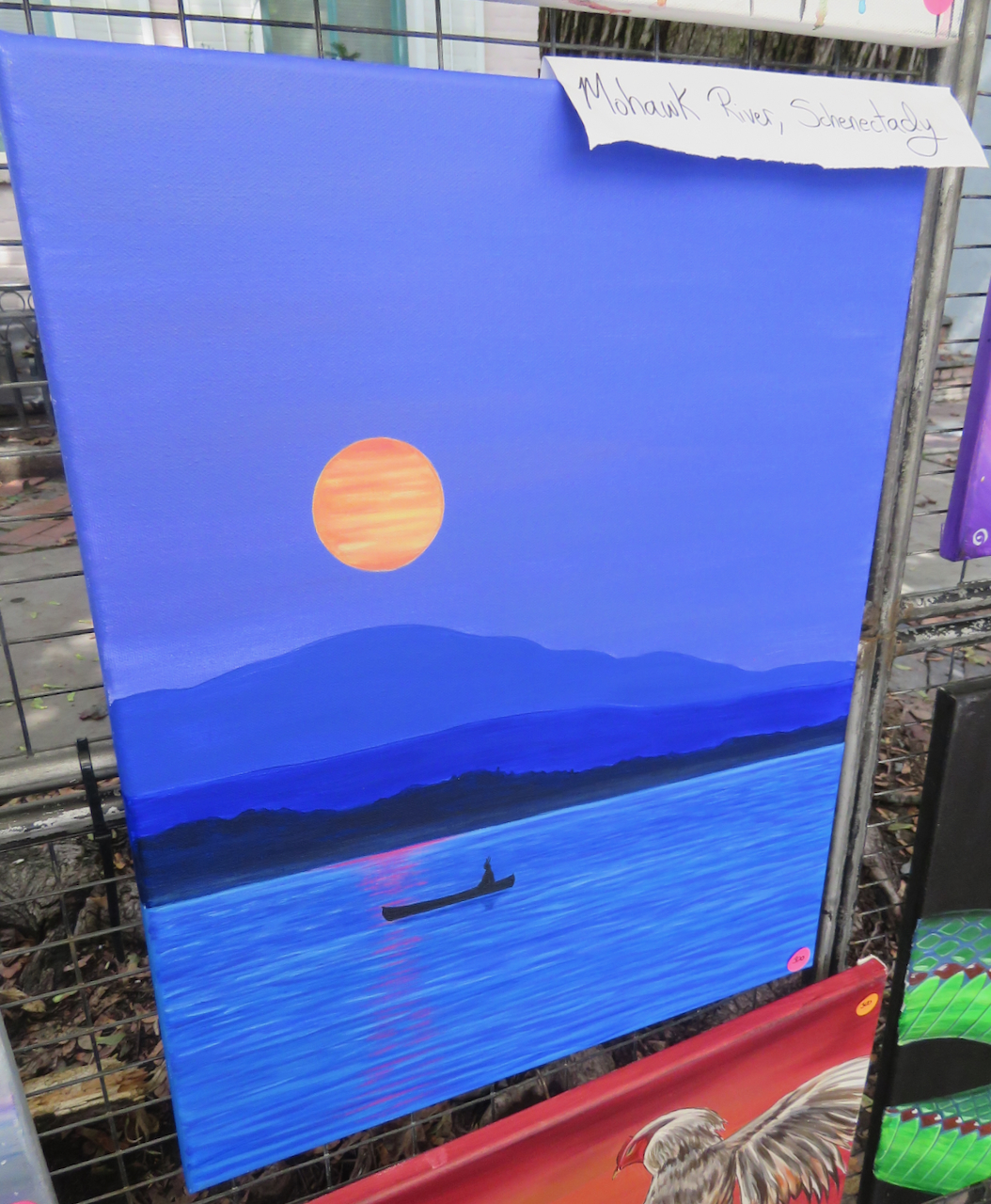 For example, KIM LEAHEY was back with her colorful KILAARTS display. Kim reminded me that the sun was rising over hills to the east and over the Mohawk River and its travelers long before the Stockade was erected in the village of Schenectady. The image to the left is, therefore, her Stockade Depiction for 2023. I suggested she add the word Stockade to the painting’s descriptive note, and Kim readily complied. Everywhere I looked in her tent, there were images I wanted to share: