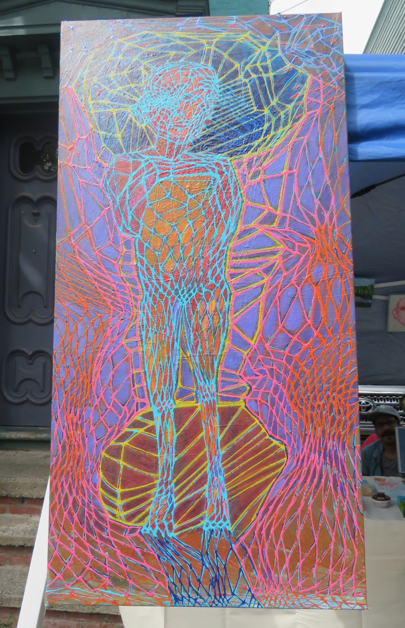 Before I left Front Street, I entered the multi-layered-styled-textured-dimensional-plus world of Troy artist Robilee McIntyre. There was so much going on, I was surprised to see the First Time Exhibitor label when I got back home. Curious to learn more about the artist, I discovered one can keep very occupied and interested browsing her Fuzzy Light Bulb Studio website (but I had to stop and get this webposting finished). I’m glad I got to meet Pink Betty and the “Dandism” dudes.